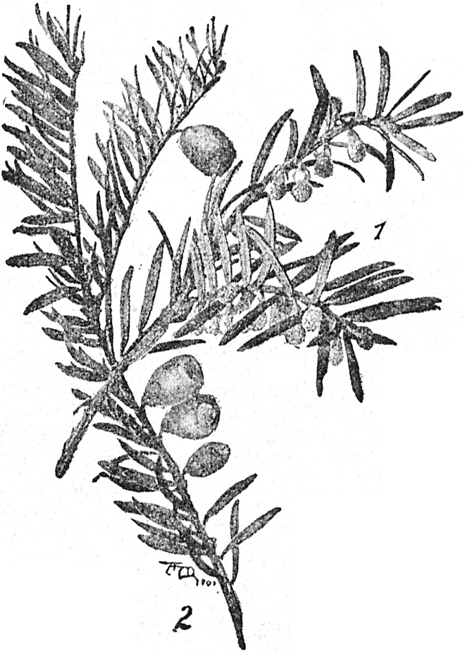 Es gibt noch einen anderen Baum, den ihr gut kennt, und der auch nadelförmige Blätter hat. Diese wachsen alle um den Stamm herum, zwei zusammen in jeder Scheide, aber sie stehen in Reihen an den beiden Seiten des Zweiges wie die Federstrahlen an dem Schaft der Feder. Dies ist die Eibe, die man so oft in Parks und Gärten findet. Sie trägt keine Zapfen. Ihre nackten Samen sitzen einzeln in einer roten, saftigen Beere. Die Staubgefäßblüten wachsen nicht auf demselben Baume wie die roten Beeren, aber wenn ihr sorgfältig sucht, werdet ihr sie auf einem anderen Baume finden.