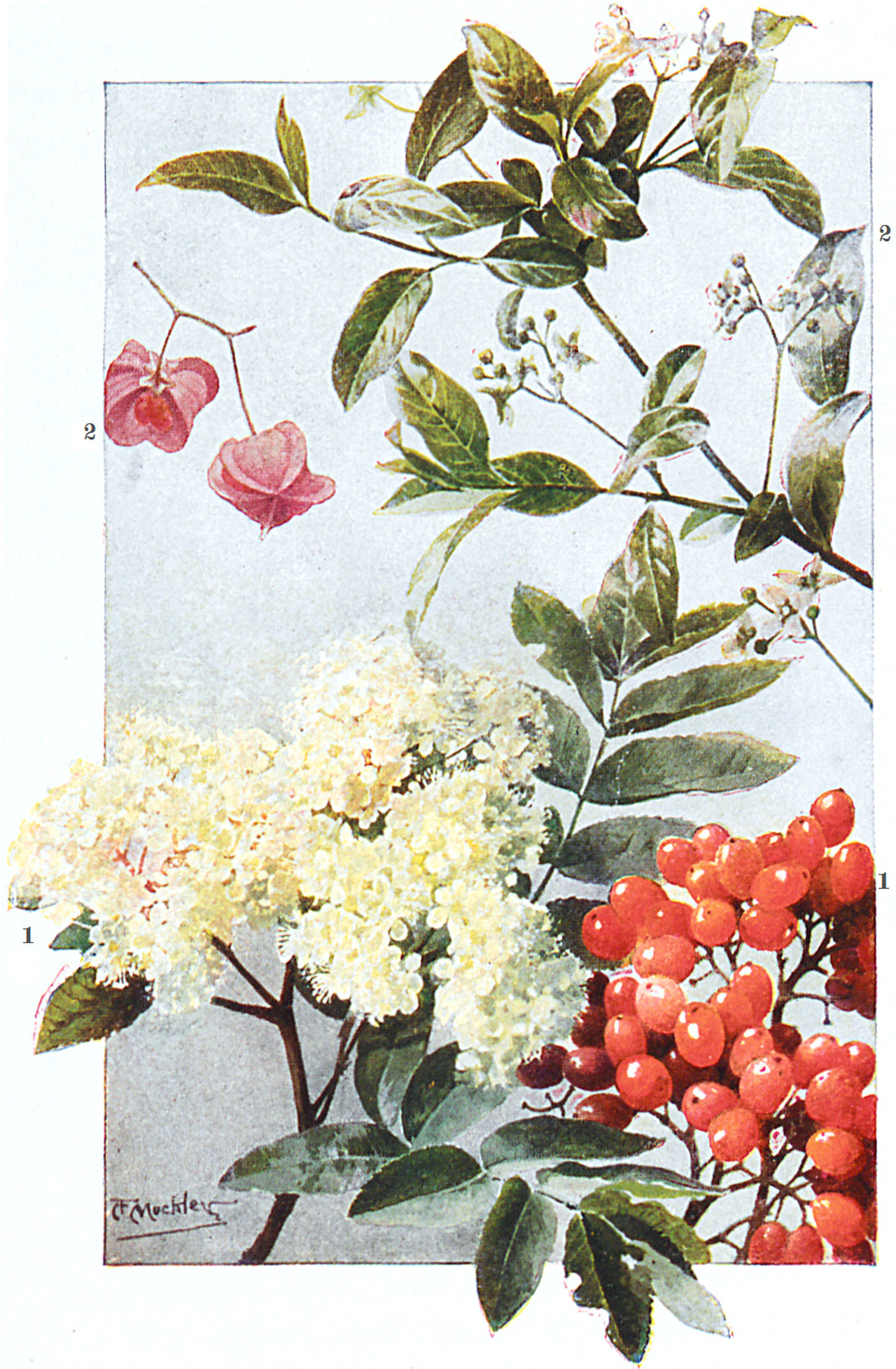 Noch von zwei anderen Heckensträuchern will ich euch erzählen. Der eine ist der Schneeball (2, S. 47), der dunkelgrüne, drei- oder fünfzackige Blätter mit gekerbtem Rande hat. Diese Blätter färben sich im Herbste schön rot. Seine weißen Blüten wachsen in einer flachen Dolde. Die äußeren sind groß und haben weder Staubgefäße noch Fruchtknoten. Ihr Zweck ist, Bienen und andere Insekten anzulocken, die zu den kleineren Blüten in der Mitte kommen, um Honig zu holen. Diese mittleren Blüten sind vollständig, und die[S. 47] Insekten bringen Blütenstaub auf die Narbe, so daß dann im Fruchtknoten Samen gebildet werden kann. Der Schneeball trägt im Herbste schöne korallenrote Beeren.