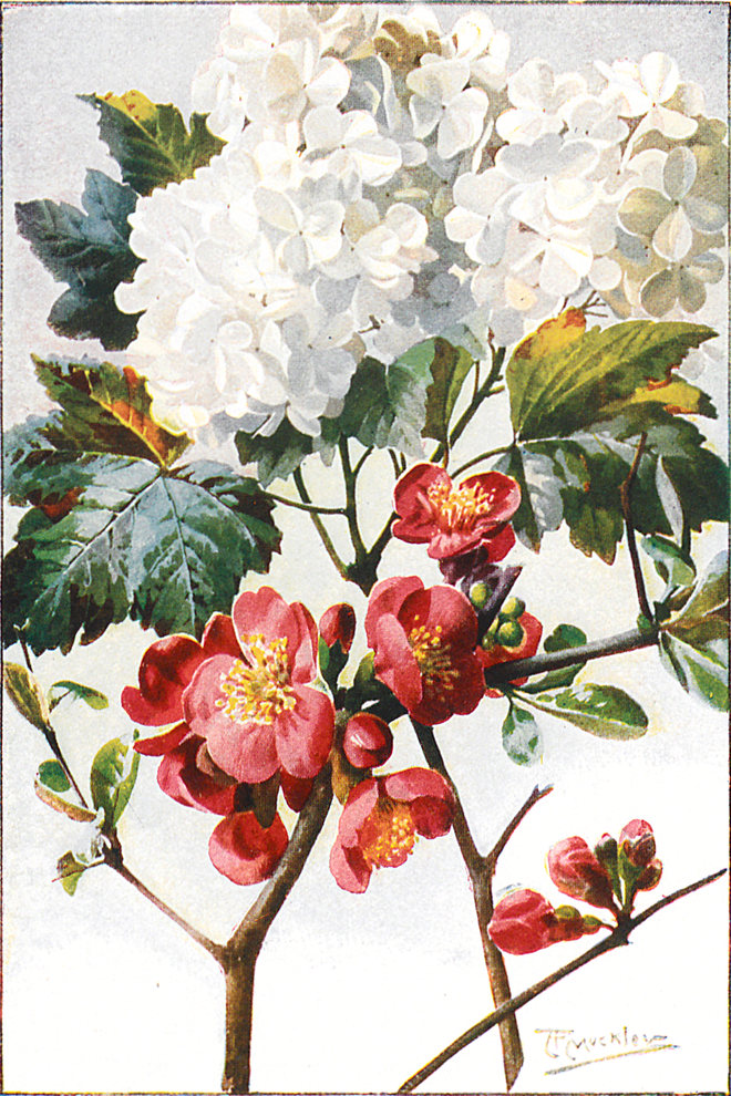 In Hausgärten, wo kein Platz ist, große Bäume anzupflanzen, kann man doch in den Ecken viele blühende Sträucher ziehen, und viele von ihnen sind sehr hübsch. Der erste, der im Jahre blüht, ist die japanische Quitte (vergl. bunte Tafel VII). Sie wächst an den Mauern der Landhäuser und verleiht ihnen ein freundliches Ansehen, auch wenn die Bäume kahl sind. Ihre dunkelroten Knospen zeigen sich schon im März, und während des April entfalten sich die tiefroten Blüten. Sie gleichen in der Form Birnblüten und wachsen in kleinen Büscheln dicht am Stamm. Wenn man keine im Garten hat, wird es leicht sein, einen Ableger von dem Strauch irgend eines Nachbars zu erhalten und groß zu ziehen. Im Herbste trägt sie eine harte grüne Frucht.