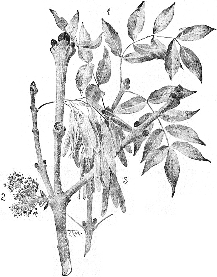 Der Baum ist den ganzen Sommer hindurch sehr[S. 54] schön, und seine blaugrünen Blätter unterscheiden sich deutlich von denen aller anderen Bäume. Aber früh im Herbste werden sie gelb und fallen ab. Dann kann man den Baum an seinen sonderbaren, langen, flachen, schmalen Früchten (siehe Abbildung, 3) erkennen, die in Büscheln von den Zweigen hängen wie ein Schlüsselbund. Sie hängen manchmal[S. 55] noch mitten im Winter am Baume, bis die rauhen Winde sie abreißen.