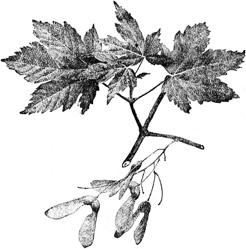 Die Frucht dieses Baumes ist sehr sonderbar. Sie ist geflügelt wie die der Esche, aber zwei Früchte wachsen zusammen,[S. 60] so daß die beiden Flügel sich wie die eines Schmetterlings ausbreiten (siehe Abbildung). Die Flügel der Feldahornfrucht breiten sich weiter aus als die des Bergahorns.
