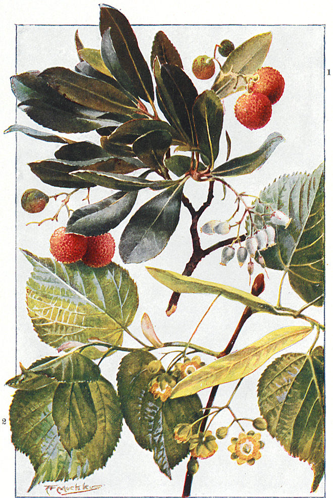 Ich möchte euch nun noch von einem anderen baumartigen Strauche erzählen, der in Südeuropa heimisch ist und bei uns zuweilen in Parkanlagen und Gärten gezogen wird. Es ist der Erdbeerbaum, so genannt, weil seine Früchte Erdbeeren ähnlich sehen. Es ist ein immergrüner Strauch mit grünen, glänzenden Blättern von der Form eines Lorbeerblattes, die am Rande grob gezähnt sind. Die krugförmigen Blüten sind wachsgelb und hängen an gebogenen Stielen. Aber das Sonderbarste an diesem Strauche ist, daß es ein Jahr dauert, bis die Früchte reif werden. Zuerst sind sie blaßgelb, dann färben sie sich immer dunkler bis sie glänzend rot sind und zu zweien oder dreien zwischen den dunkelgrünen Blättern hängen, gerade wenn der Baum wieder seine hübschen weißgrünen Blüten treibt.