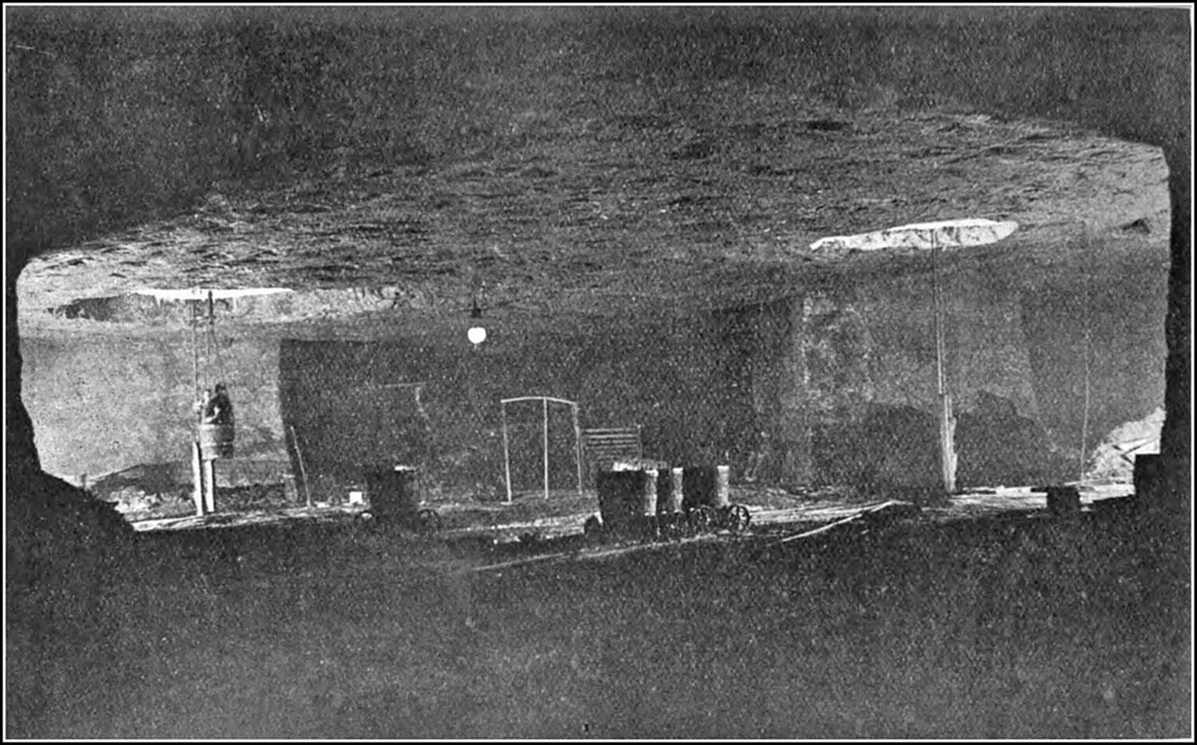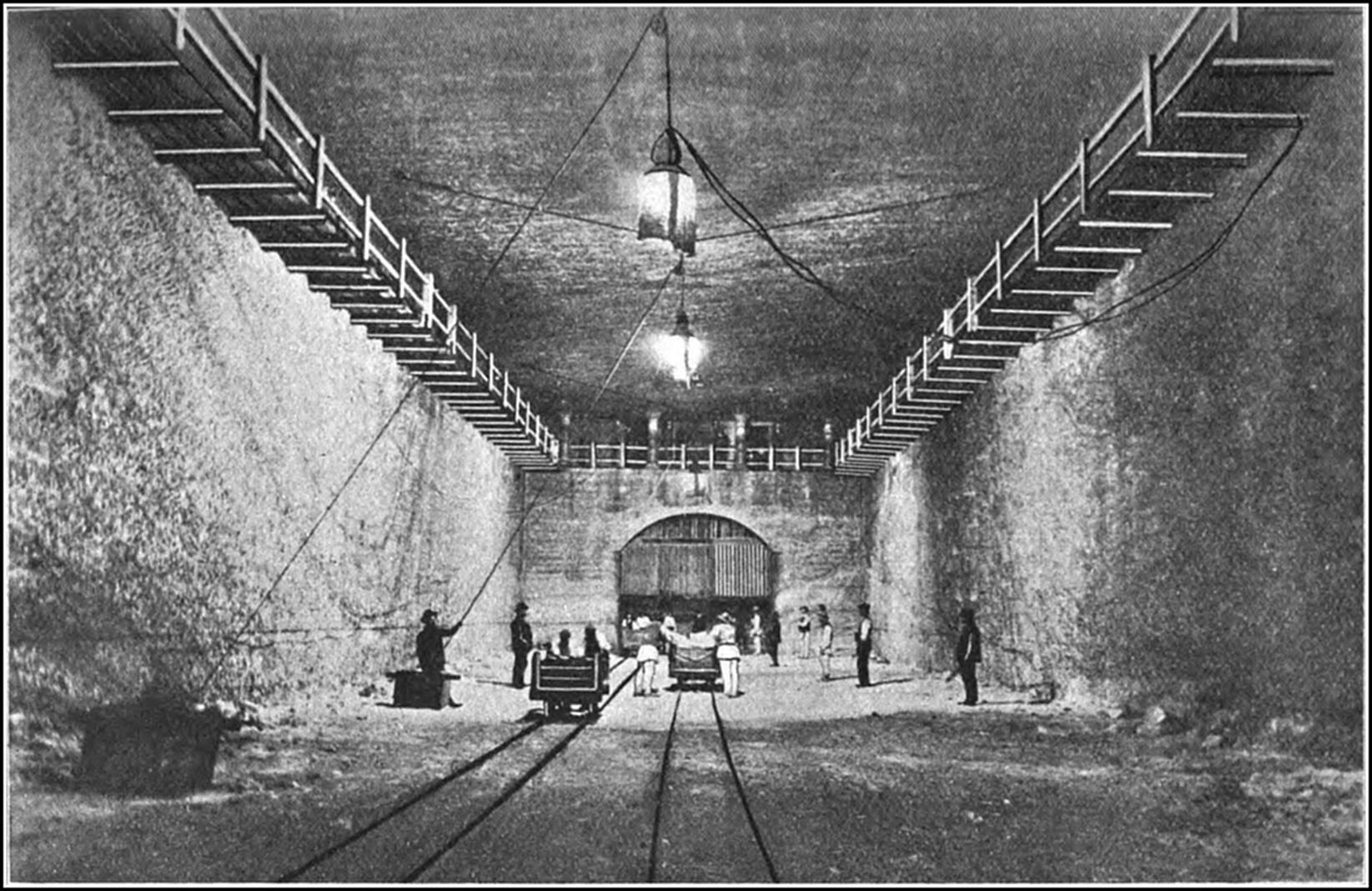 As soon as the miners had sunk the shaft to the depth of the sole or floor of the mine and had made an opening large enough for their purpose, they proceeded to blast off enough rock to form a chamber about 5 ft. high. This formed, they advanced by blasting off the rock-salt from the face of the seam. The salt was loaded into waggons, which ran along small railways to the mouth of the shaft. The men engaged in blasting the rock and squaring the walls and pillars (for these were left quite square and well hewn) were called miners ; those who loaded the trucks and conveyed them to the shaft were ferriers. They were a fine set of men, and their occupation, compared with coal-mining, was a very healthy one. The mines were of an equable temperature, and were sufficiently warm for the men to dispense with their shirts. Being lofty, the air was pure, except when excessive blasting was undertaken. The greatest number of men employed in one pair of shafts was about eighty, and the quantity of blasting powder used by that number in the course of a day averaged 1 cwt. Safety fuses were seldom used, the charge being fired by a straw filled with fine powder, which was lighted from a candle.
