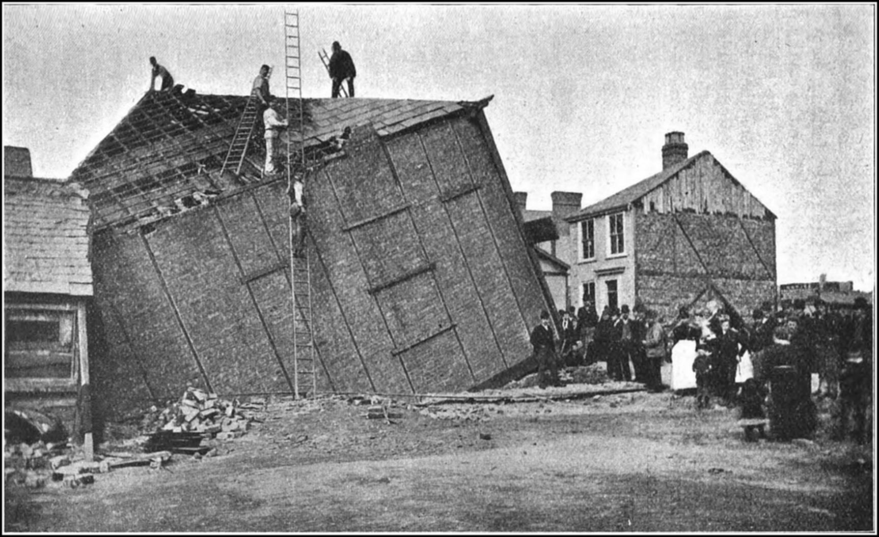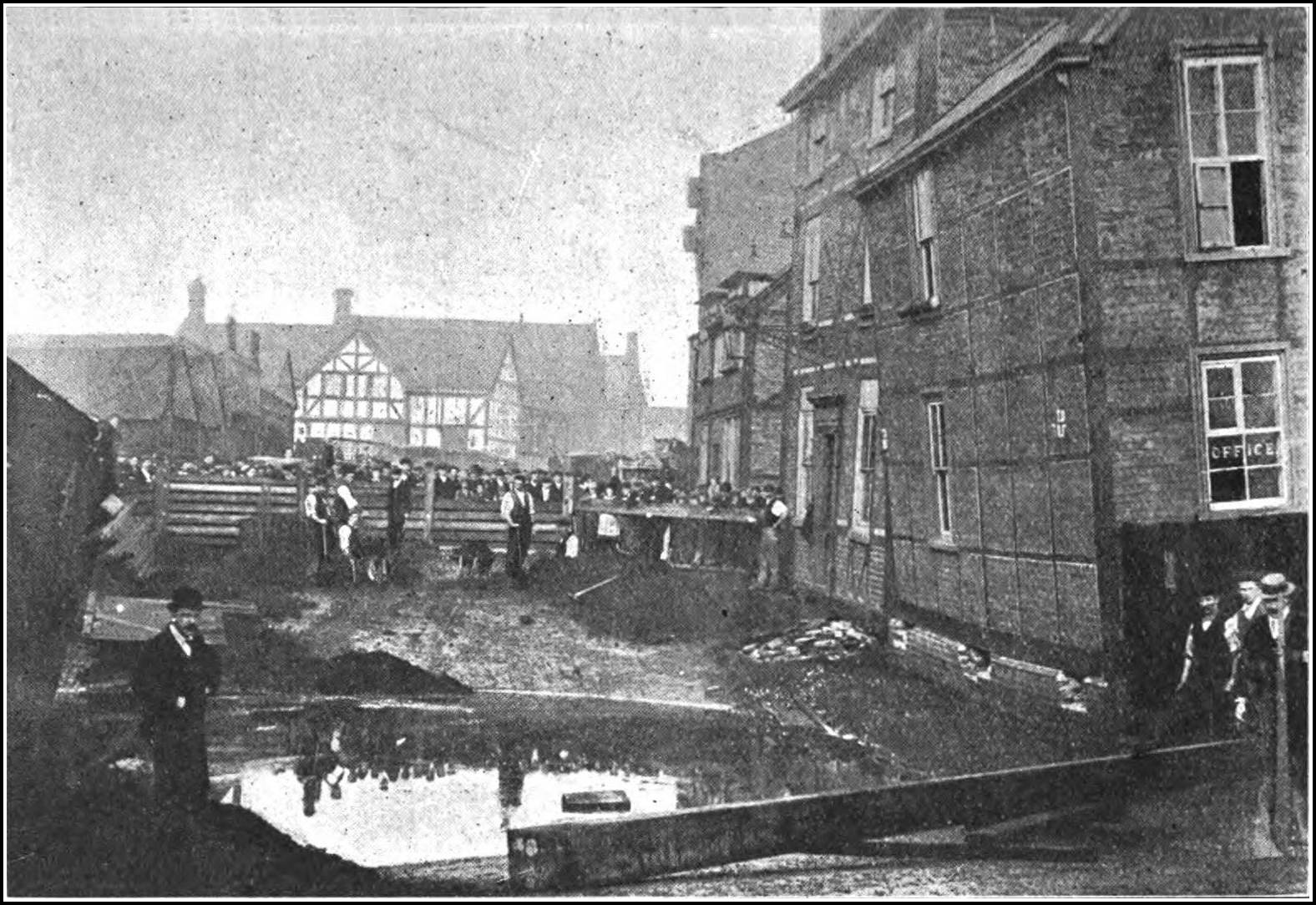 For over half a century the appearance of Northwich, with its undulating streets, its ramshackle, dilapidated houses, its fissured walls, and its system of shoring and bolting-up of property to postpone as long as possible its inevitable condemnation and demolition, has presented a tragico-comic spectacle. “If a stranger were to be set down some morning in the town of Northwich,” wrote a Times correspondent, “without any previous knowledge of its peculiarities, he would be struck with a startling and novel spectacle. He would see buildings of every sort, from the humble, two-storeyed cottage of the artisan to the solidly built church or chapel, standing many degrees out of the perpendicular, and suggestive, all of them, were it not for the props and iron stays with which they are secured, of some recent convulsion of nature. In main thoroughfares and back streets alike there are houses whose sloping floors and cracked walls would lend considerable colour to such an effort of the imagination. The inhabitants seem to take this tumble-down state of their dwellings quite as a matter of course. They have, in fact, to make the best of a condition of things from which there is absolutely no escape. The effects described are produced, not indeed by any sudden catastrophe, but by a slow, though equally effective process of subsidence, which may be detected in continuous operation over nearly the whole area of the Cheshire salt field, and which will continue to operate so long as the earth yields its vast stores of salt for human consumption.”
