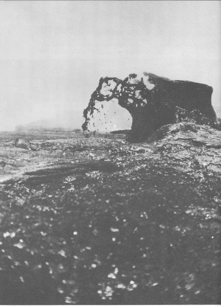 Such a submarine arch was definitely not present, for the waves surged back and forth and, Matsumoto states, there was no sign of a submerged reef. The motion picture bears this out. What was probably going on is what happens to slag in a patented process of the steel mills, where the glow liquid is flowed over a perforated surface emitting hundreds of water jets, and the melt at 1300° Centigrade absorbs the water without making visible steam. The slag turns into a myriad of microscopic glassy spheres, becoming a[175] kind of pumice. A peculiarity of this substance is that if it is cooled at 700° Centigrade it will pass a critical point and give up the absorbed water with explosive effects. It seems likely that Matsumoto’s golden torrent sweeping into the ocean was so excessively hot that it took up the water and continued to flow down the sea bottom as a water-charged product. The snapping and crackling effects, and the submarine earthquakes, making localized tidal waves such as those noted in 1919 when such a torrent entered the sea, may be due to the explosive cooling when the slag gives up its water.