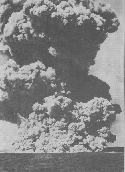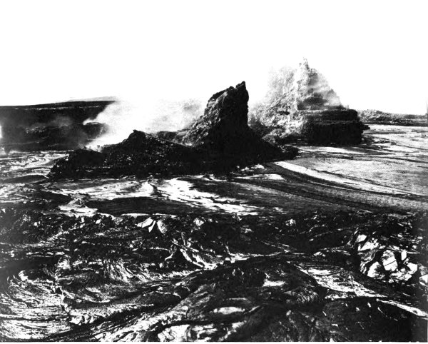 The result was most remarkable. The yellow liquid lava went into the salt water without making any column of steam at all; the sea bottom simply received it with its rush downward, the water boiling superhot, and the lava taking the water vapor into itself. The phenomenon was not due to the rising of dry steam, for there was no condensation cloud above. Scientists explained it by assuming a shell of lava making a tunnel under the ocean, with the crust ending just at sea level.