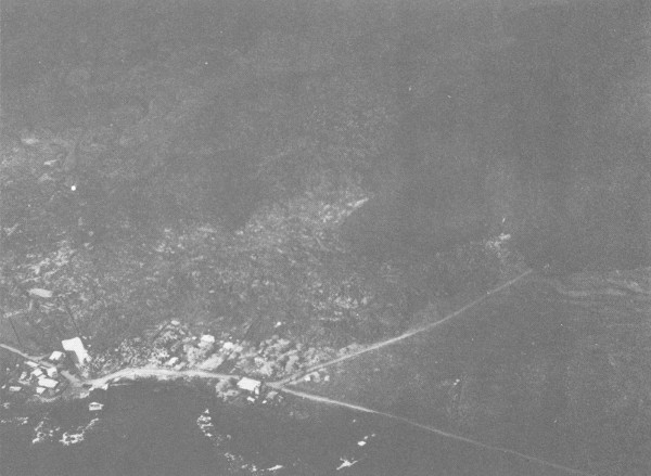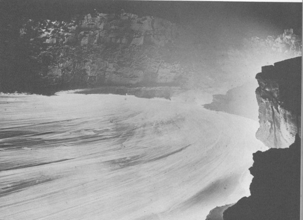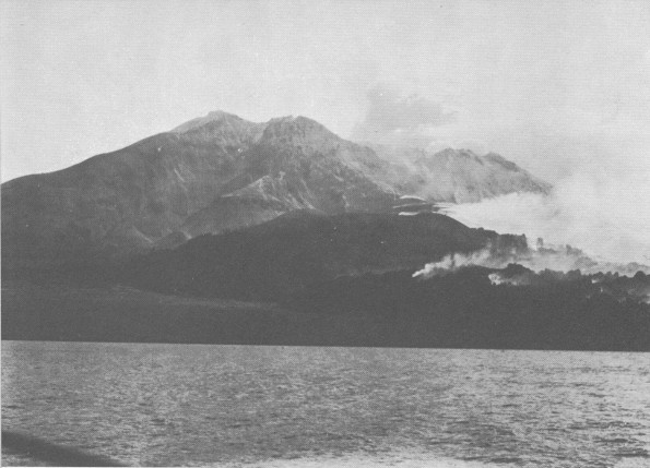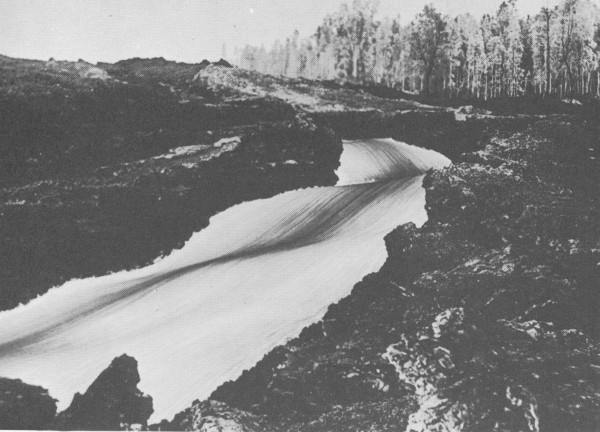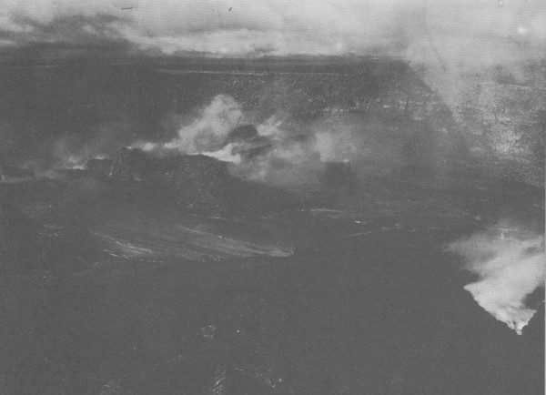 Several persons approached the flows in South Kona from the ocean. The early photographs of the first flows, where the hard sprouts and boulders of stiff aa partially cooled entered the ocean, showed big columns of vapor from contact with sea water. Not so with the third flow farthest south, explored from a canoe by Jack Matsumoto and a companion, equipped with motion picture cameras. The pictures were good color photographs, and the torrent of lava flowed down a steep bank of its own substance, hemmed in by hardened ridges at the sides, the stream intensely liquid and flowing directly into the ocean.