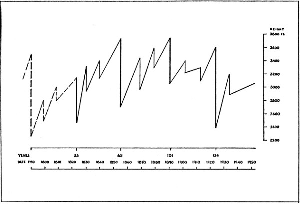 The use of color motion pictures is one of the many improvements owed to modern science, and the mapping of lava flows by airplane photography. This gave Macdonald a new weapon for surveying the volume accumulation at the time of the 1950 outflows, for from air photographs he got exact outlines of the flows. These, checked against calculated thicknesses, gave him volumes which could be compared with volumes of older flows proportionate to areas. These calculations showed that nothing since 1868 has yielded such large volumes of lava, per days of outflow.