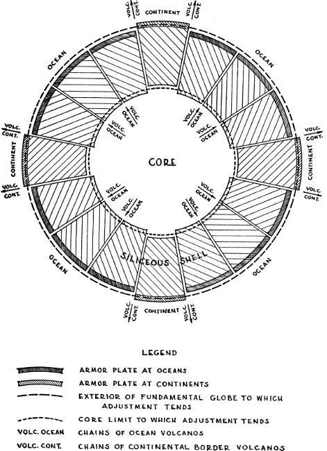 On the page opposite is a diagram of a hypothetical globe section near the equator, showing oceans and continents in true surface ratio; fault block segments of rigid crust isostatically supported on a liquid core; sixteen volcanic partitions, oceanic and continental; and Stübel’s “armorplate” from pristine volcanic eruption. Possibly the profile is tetrahedral. My argument for this globe section is based on the following: