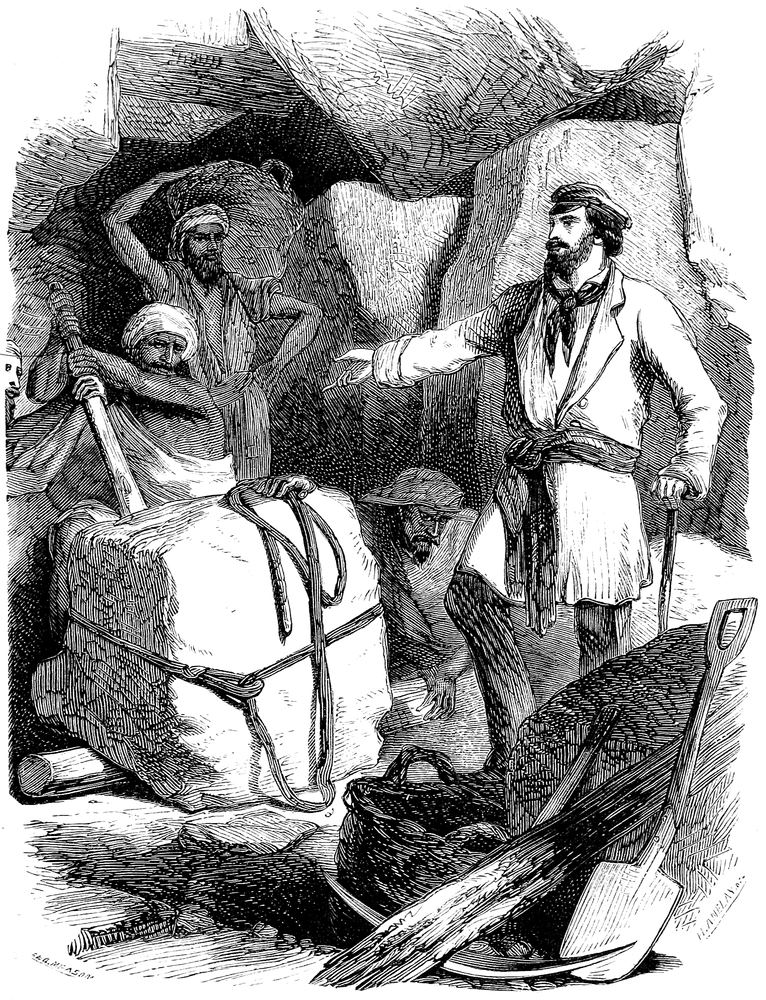 Suddenly the enterprise was checked by the sinking of the stone to a depth of eighteen inches in the road, to the chagrin of the engineer, who was suffering under a severe attack of marsh fever. Lascary, however, was not disheartened, and speedily remedied the accident, spite of the idle clamours of the multitude; and in six weeks from the time of first drawing the stone from its bed, he had the satisfaction of seeing it safely deposited on the temporary wharf built for the purpose of embarkation on the banks of the river, when the charge fell into the hands of the Admiralty, who had undertaken the transport by water to the city.