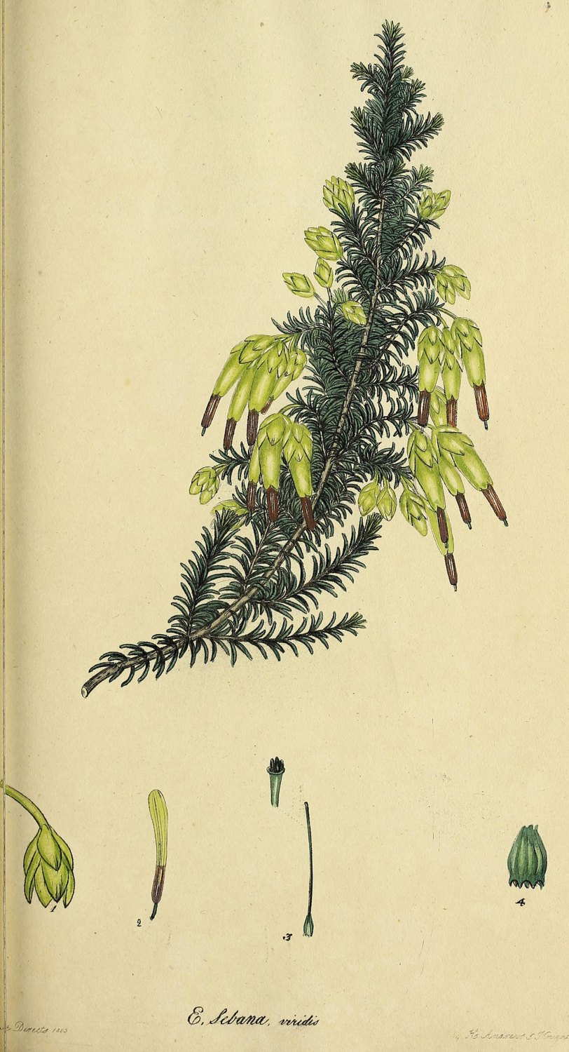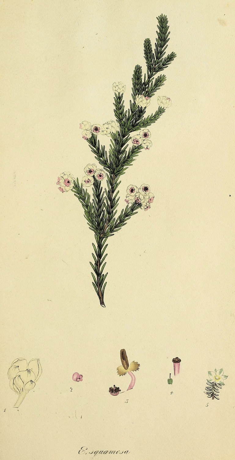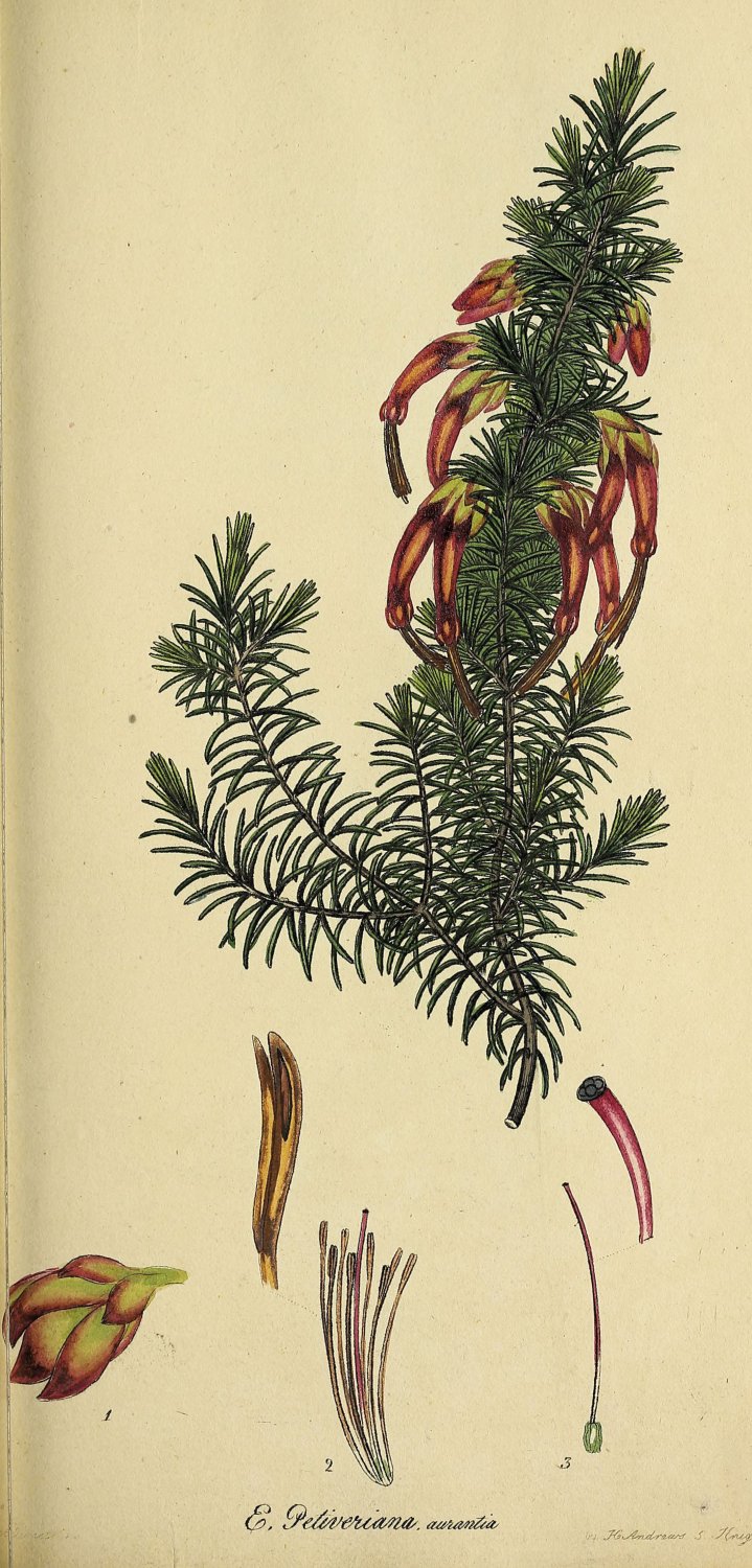The unabating ardour that still prevails in the science of botany, and rather increases than diminishes, renders it almost impossible (from the extreme minutiæ annexed to this elegant tribe) for the pencil of the artist to keep pace with the numerous importations from the Cape (at present the sole emporium of the genus Erica): the limits of the genus it is impossible at present to prescribe, but by the termination of the next Volume we have no doubt of being able to ascertain, in some measure, its extent. The Author’s intention is therefore to figure (first) all the most elegant and desirable of the genus, including many very beautiful varieties, of recent introduction, that far surpass those from which they derive their name; reserving, as a dernier ressort, the most uninteresting and least attractive, to subjoin at the termination of the genus, as necessary links in the chain of this extensive family. The great difficulty attending the cultivation of many of the species, so generally complained of, can only be surmounted by great care and attention to keep them from the partial damps and fogs so prevalent in this island. Among the most tender and difficult to preserve, and which require the most care are the E. obbata, E. retorta, E. ampullacea, E. Aitonia., E. Jasminiflora, E. vestita alba, and E. Massonia; the last of which is perhaps the most tender, owing most likely to the closeness of the leaves, joined with the soft hairs that surround them, which is a great encourager of secreted damps: this, assisted by the great succulence that pervades the upper part of the plant, and its rather abrupt commencement from the wood, renders it so difficult to be preserved. They should by no means be intermixed with other plants, but kept in a house entirely appropriated to them, and so arranged that the air may have as free an egress and regress as possible to them all; as undoubtedly the mixing of them with plants whose foliage is so much larger, although it may produce a pleasing contrast, must exclude the free approach of the atmosphere, to which they are so much exposed in their native clime, and to which the nearest approximation must [Pg 6][Pg 5][Pg 4]certainly be most congenial.