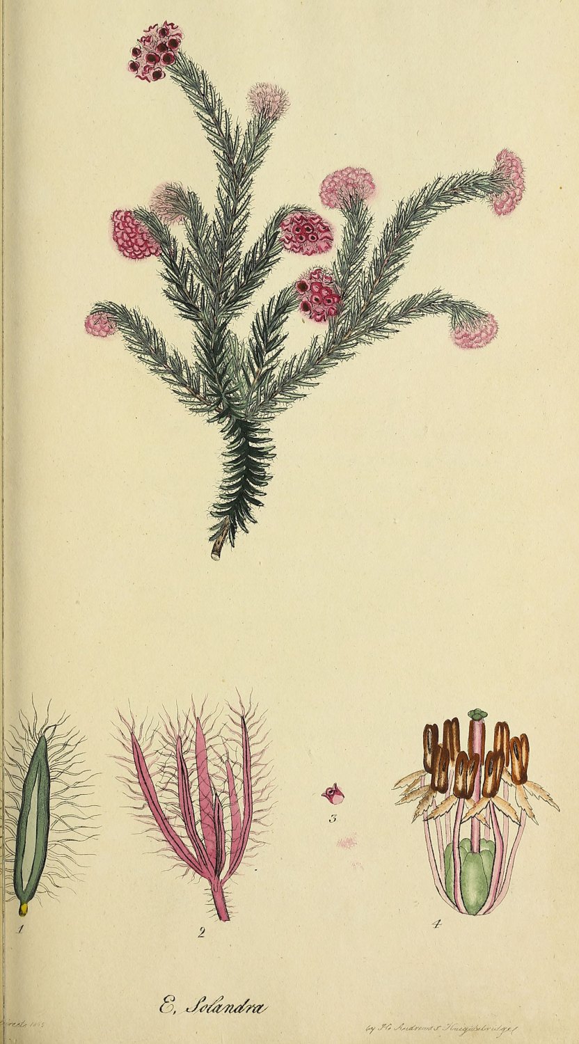 Tips beardless, within the blossom. Flowers in fours, terminal on the lesser branches, in little sessile heads. Blossom ovately cone-shaped, smooth, shining, and of a deep flesh-colour. The segments are nearly ovate, and spreading. Leaves by fours, rather spreading, linear, smooth, and shining. Stem shrubby, a foot high, upright. The branches are often a little bundled and spreading.