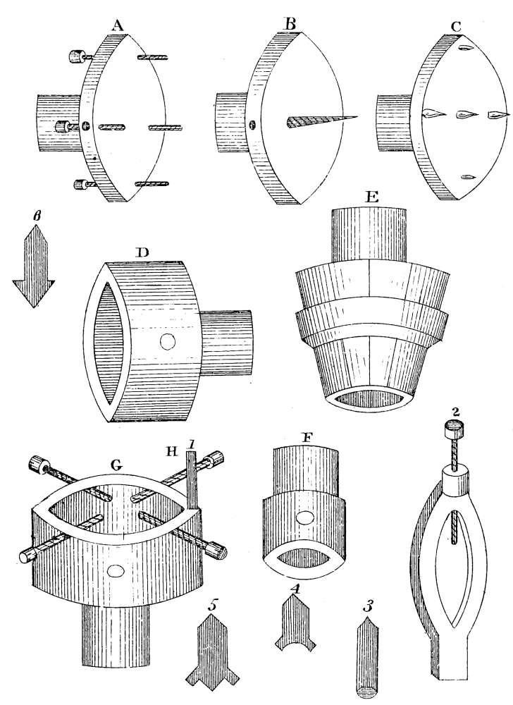 The bottle, B, is also ornamented with the same tools. It is hollow down the neck, and is intended to contain a tin or glass of water; in the stopper is glued a small camel’s-hair brush, which rests in the water, and is meant to be used for wetting postage-stamps, and fastening them upon letters. The bottom of the neck unscrews at fig. 1, and the part below it is hollowed out like a box, to hold the stamps. The neck is ornamented in steps. Set the cutter quite flat, facing the side of the work; use the tool No. 5; cut one line, move the brass wheel of the lathe just far enough to make the second cut join the first, and the same all round. In the next row make the first cut half-way between the others; thus, if you have begun at the numbers, 1, 6, 12, in the second row begin at 3, then go to 9, then to 15, and so on. Every row of steps begins half-way through the former ones, and for each row move the cutter on the slide rest the breadth of the tool. The convex moulding at the bottom of the neck is done by putting one of the[Pg 92] hollow tools of the sliding rest into a handle, and rounding the ornament with it. The other patterns are all done with the same cutter, by placing the tools at different angles. In the same plate, 9, the two patterns F and G are very beautiful, they are worked with the eccentric cutter. F resembles the scales of fish lying one over another: put the most angular tool, No. 5, (of the cutter tools), into the cutter; describe a circle from the edge of the middle line to the outer one; cut one circle very deep, move ten numbers on the brass wheel of the lathe, and so on to the end.