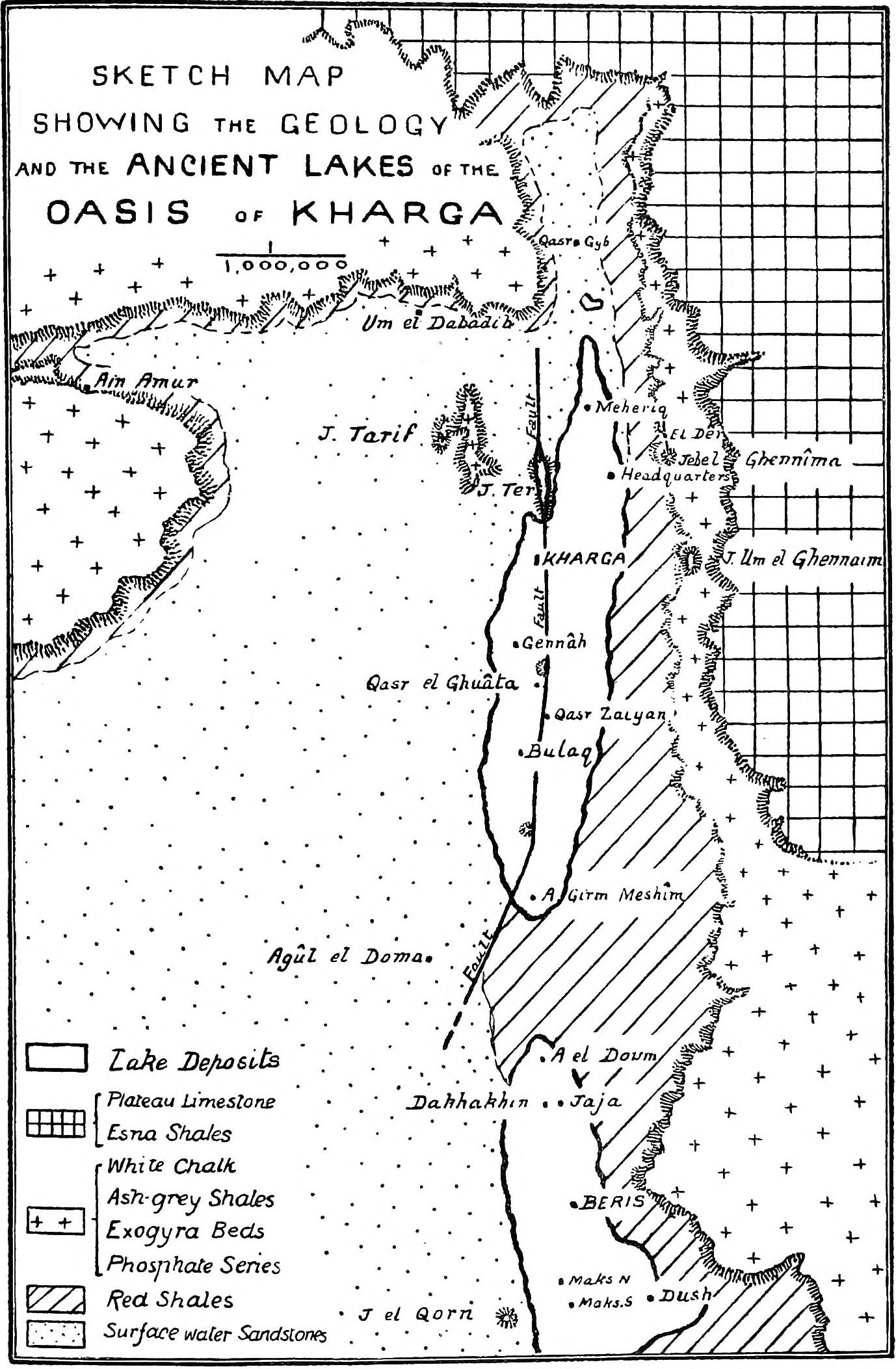 [3]Since writing the above, I have read with much interest a paper on the South-West Desert of Egypt, in which my friend and former colleague, Dr. W. F. Hume, in a discussion of the formation of the oases-depressions, refers to the importance of soft and hard strata, and to the action of folding in exposing the former to the agents of denudation. This is striking confirmation of the views promulgated by me since my first acquaintance with the oases many years ago. Of great interest and value, being new, is the suggestion that the topography of the southern oases and surrounding desert may be, to a considerable extent, due to denudation acting on the country as it was in process of being elevated from the sea in which the deposits forming it had been laid down.