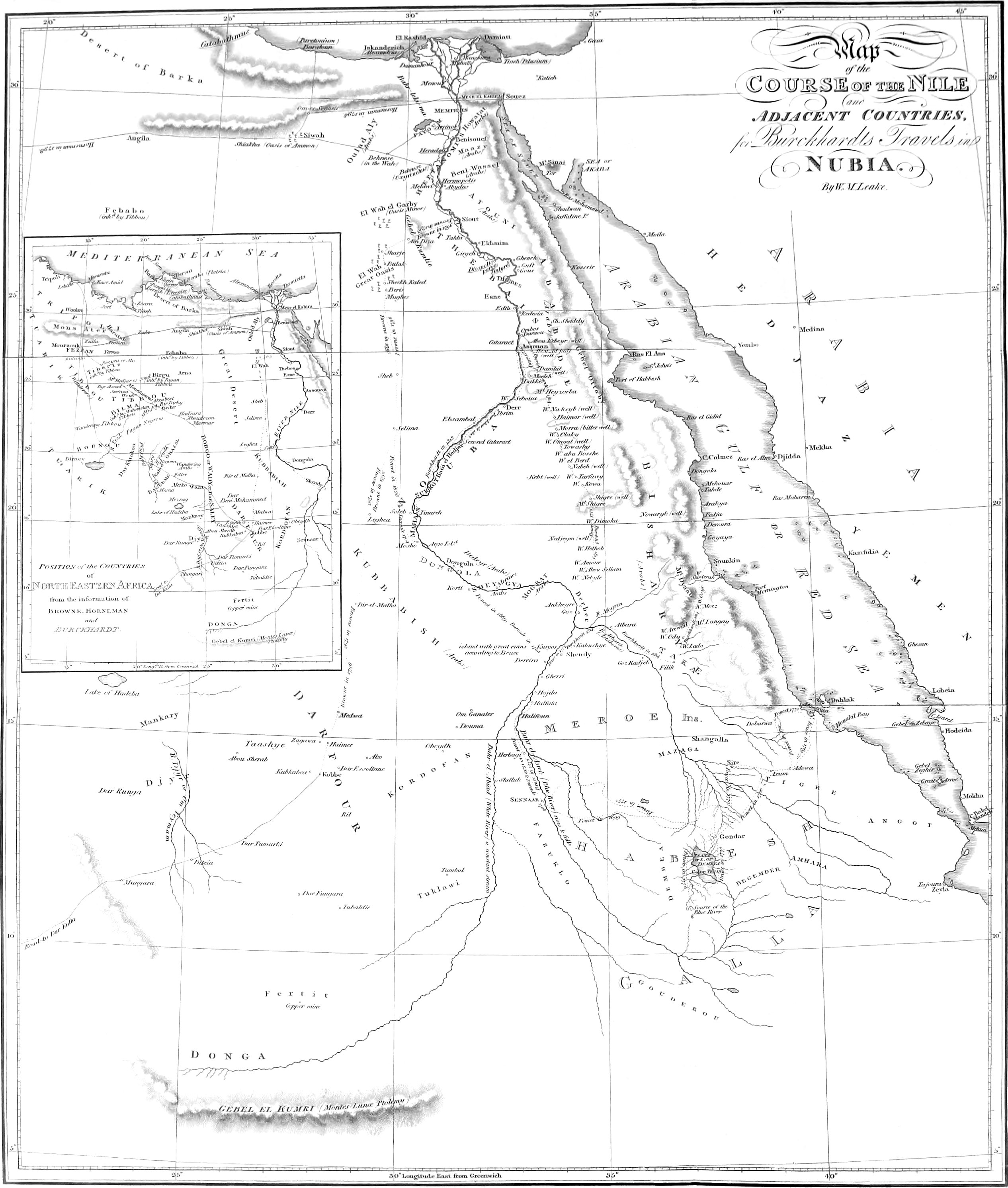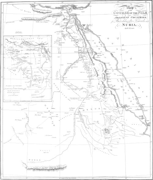 This Map has been constructed solely from the Journals of Mr. Burckhardt in the parts above Ibrim: below Seboua the bearings of the windings of the River, as taken by Messrs. Legh and Smelt were of some assistance. The Latitude and Longitude of Syene and Philæ are certain, having been observed by the French Astronomer Nouet; for the rest we are guided solely by bearings and distances: future travellers therefore will contribute easily and essentially to the correction of this part of African Geography, by a few observations of Latitude on the parts of the Nile here delineated.