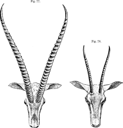 In his description Brooke pointed out that, as is well shown in the accompanying figure (p. 231), which has been copied from the plate that illustrates his paper, the skull of this Gazelle, besides its general depression, stands widely apart from those of all other species of the group in the enormous backward prolongation of the occiput—“an extension gained principally by the great size of the occipital bone and the prominence of the occipital crest.”[231] This divergence was so remarkable that Brooke doubted “whether the species should not constitute the type of a new subgenus.” As we shall see later, Brooke’s views have been fully justified by what has taken place since a close acquaintance with the structure of this singular Antelope has been acquired.
