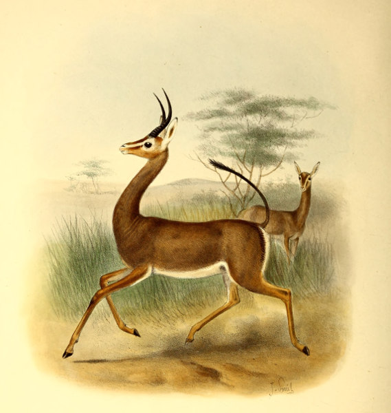 “The gait of this Antelope is peculiar, and when first seen a buck will generally be standing motionless, head well up, looking at the intruder, and trusting to its invisibility. Then the head dives under the bushes, and the animal goes off at a long crouching trot, stopping now and again behind some bush to gaze. It seldom gallops, and its pace is never very fast. In the whole shape of the head and neck, with its extended muzzle and slender lower jaw, there is a marked resemblance between the Gerenúk and the Dibatag. The texture of the coat is much alike in both. The horns of immature buck Gerenúk have almost exactly the same shape as those of the Dibatag. Their average length when fully grown is about 13 inches. The females are hornless; they sometimes lose or desert their young ones, as I have now and then come on fawns living alone in the jungle. The Gerenúk stands a good deal higher than an Indian Blackbuck, but would be of about the same weight.”