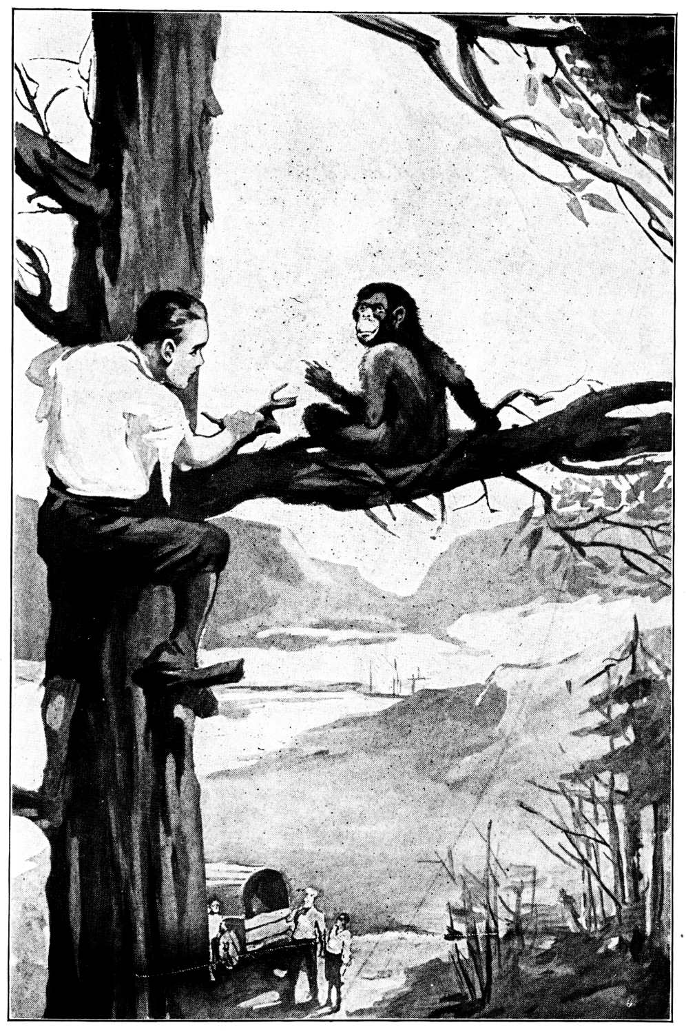 Several months after landing they captured a baby orang-outan. This had now grown to be strong and active, and as these animals have great imitative qualities, George undertook to educate it to do many things, and it succeeded, on its own initiative, in doing many mischievous tricks, which afforded amusement for all the party.