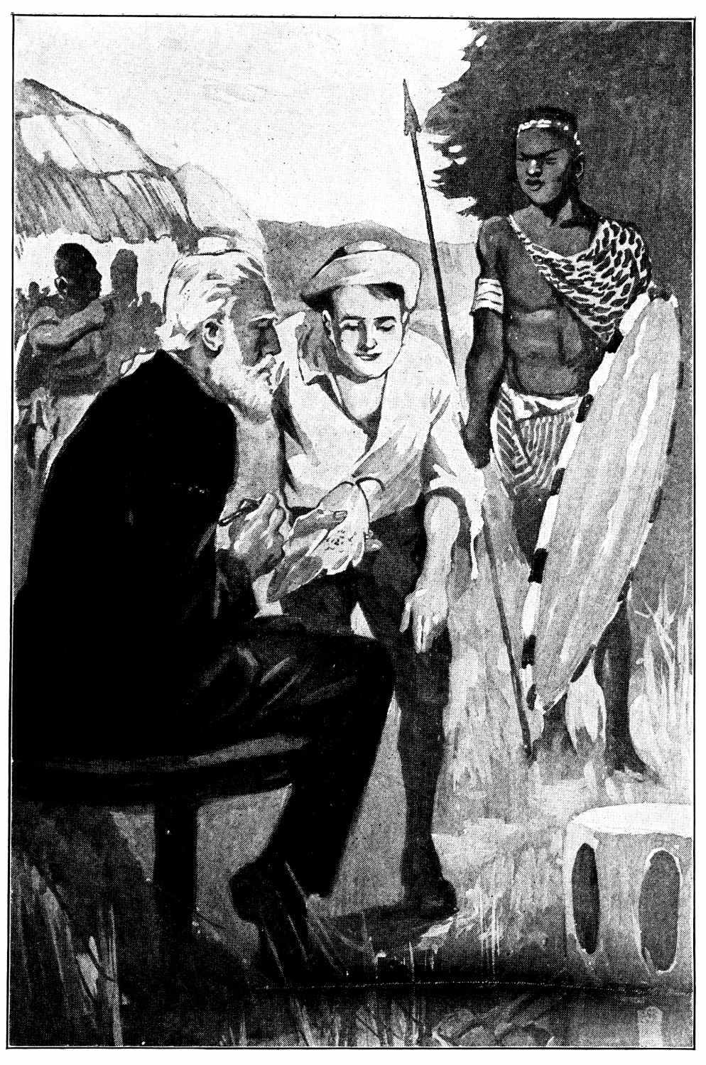 | The long watch by night. Subjects discussed. Savage persistency discussed. Cardinal points in human nature. The savages seen to the north. The “Fire Fiends.” Muro exhibiting himself to his late captors. He sees the work of the guns for the first time. The siege of the wagon. Surprise parties in the night. Taking up the fort. Continuing the advance to the south. Muro advises avoiding the Kurabus territory. The camp surrounded the second night. Mysterious disappearance of the Brabos during the night. The Professor prospecting in the hills. The noon hour. Captured. John sees the natives to the South. The effect of the Professor’s capture on the boys. The pursuit. The forest where Blakely made his home. Uncertainty as to the tribe which captured the Professor. John, Muro, and the other Saboros follow the trail of the natives. The wagon following. How the Professor was captured. Taken to the Berees’ village. The meeting {5}with the chief. Curing the chief’s daughter. Gratitude. The chief indicates that the Professor may return to his people. He refuses. Examines the village. Treats the wounded. Synthetic food. Refuses to take food. Wonder of the natives. Mystery and its part in savage life. The medicine men. Impressing them with his power. John finds himself before a hostile party. | ||