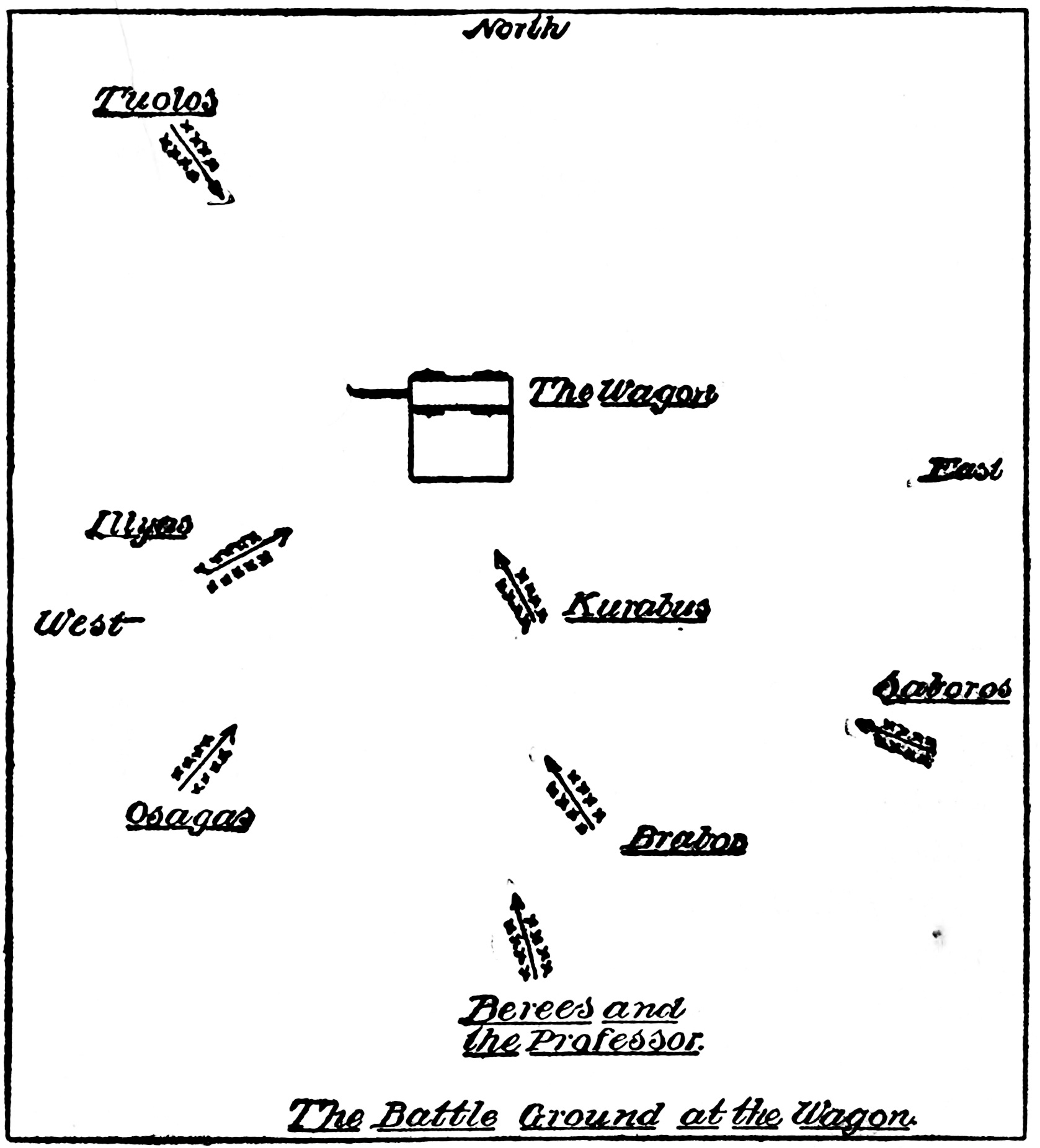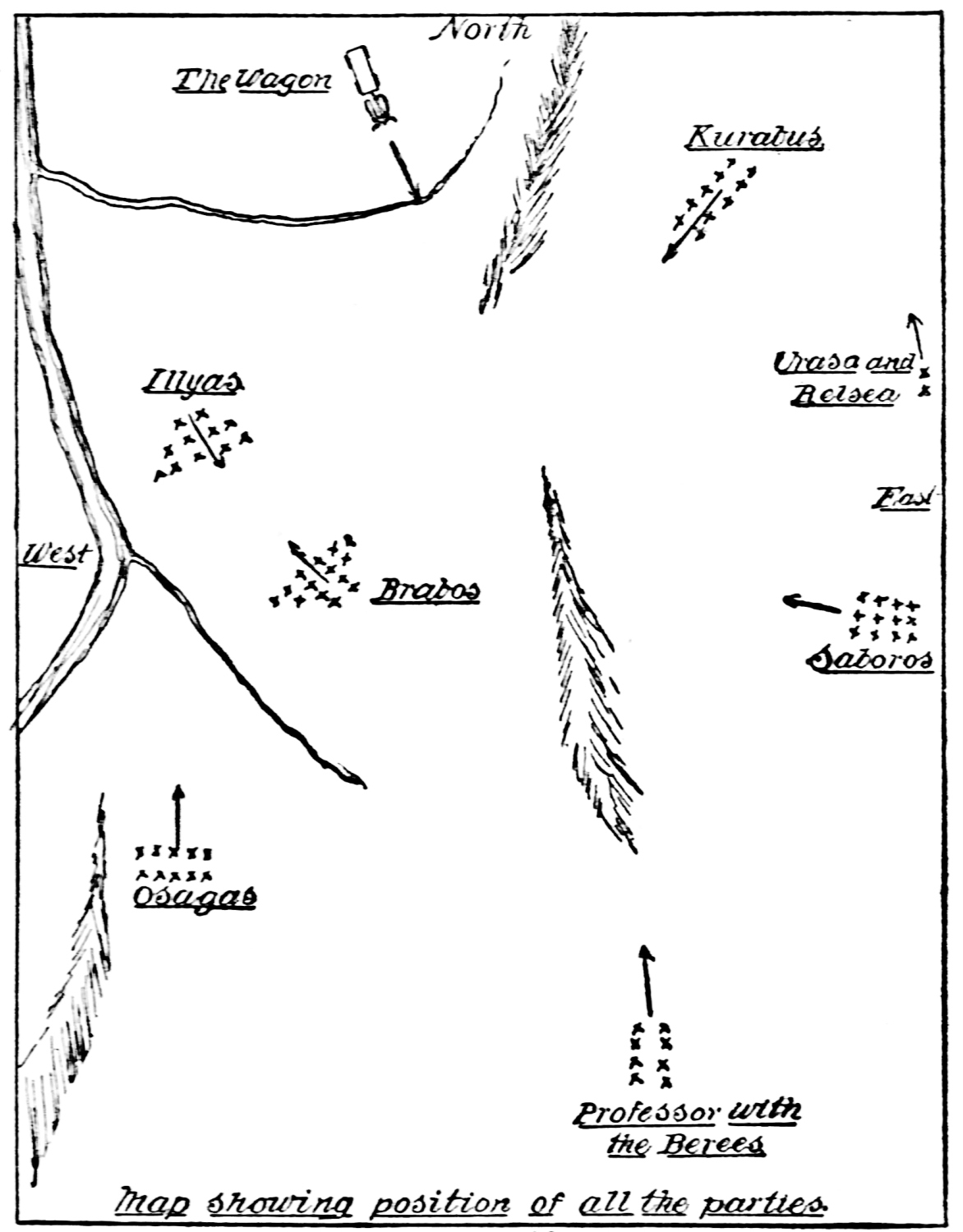 | The Kurabus joining the Illyas. The Brabos to the south of the Illyas. The wagon arrested in its westward flight. The tribes opposing each other. The arrival of the tribe from the east. A surprise. Believe it to be the Saboros. The defeat of the Illyas and Kurabus. The retreating forces. The Professor gets no word from Ralsea and Uraso. Other scouts go {8}forward. A scout returns. No sounds of guns for three days. A war party east of the Professor. The Saboros appear. The Professor appears before them. Their astonishment. Stut rushes forward. Recognizes the Professor. Combining their forces. Stut’s story. Causes of the war. Escaped when Brabos attacked Kurabus’ village. Indications that the Osagas had joined the Brabos. Stut surprised to know that Uraso had been captured by the Illyas. Learning of a treaty between the Illyas, Tuolos and Kurabus. News of the defeat of the Illyas and Kurabus. The advance. | ||