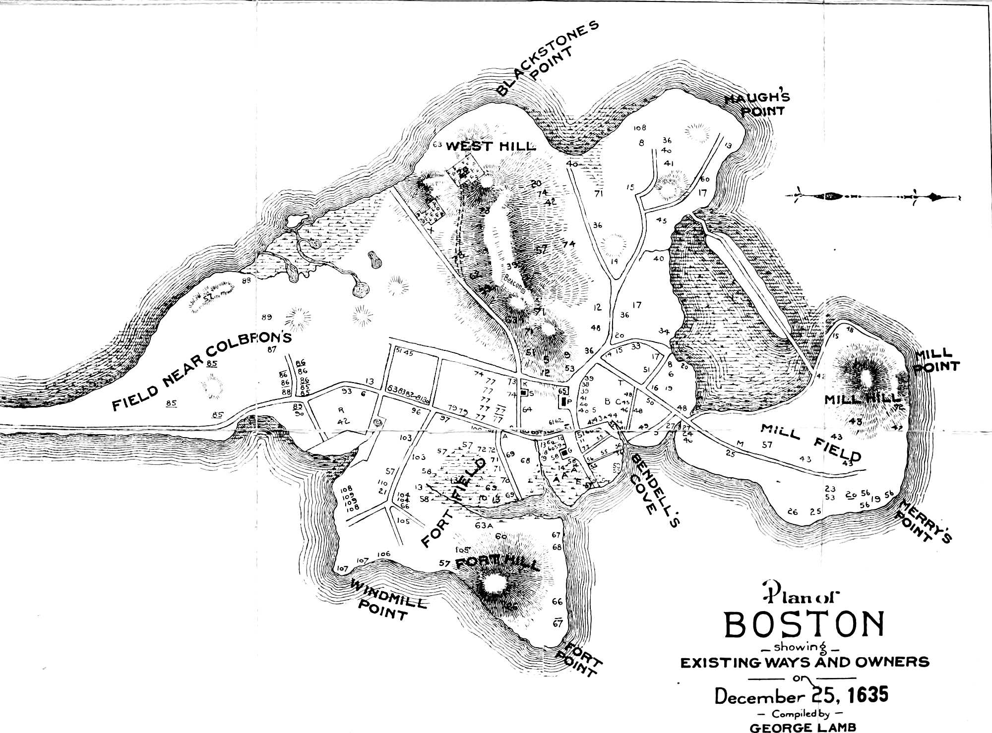 The New Field was located at the west part of the town in the angle bounded by the present Cambridge street, and extending through Lynde and Leverett streets to Haugh’s Point. The principal town landing was at the head of the cove or dock, around which Valentine Hill’s highway was laid out in 1641. Street names were not given until a later period, though the present Washington street was known as the “High street, the great street or highway to Roxbury.”