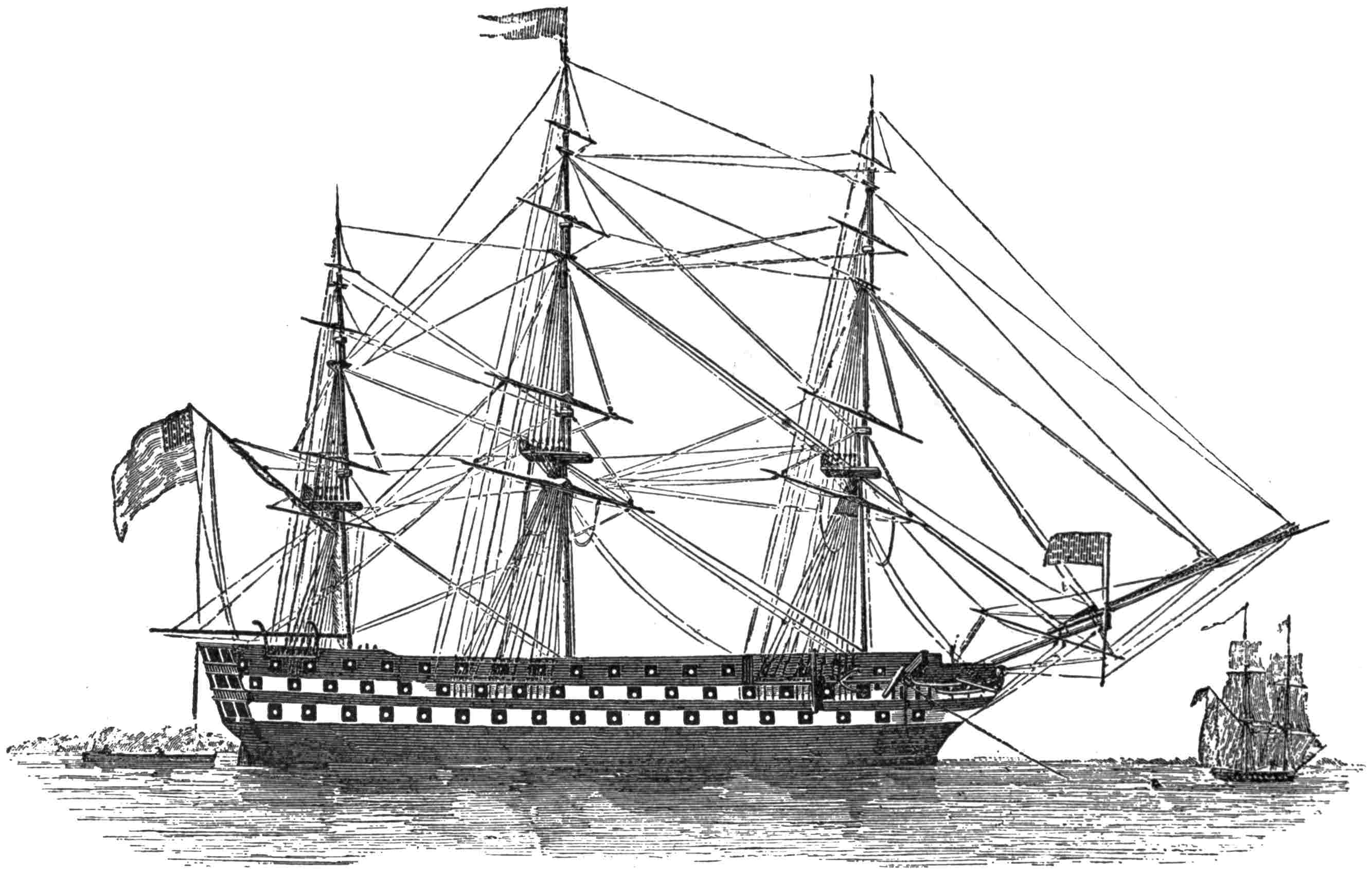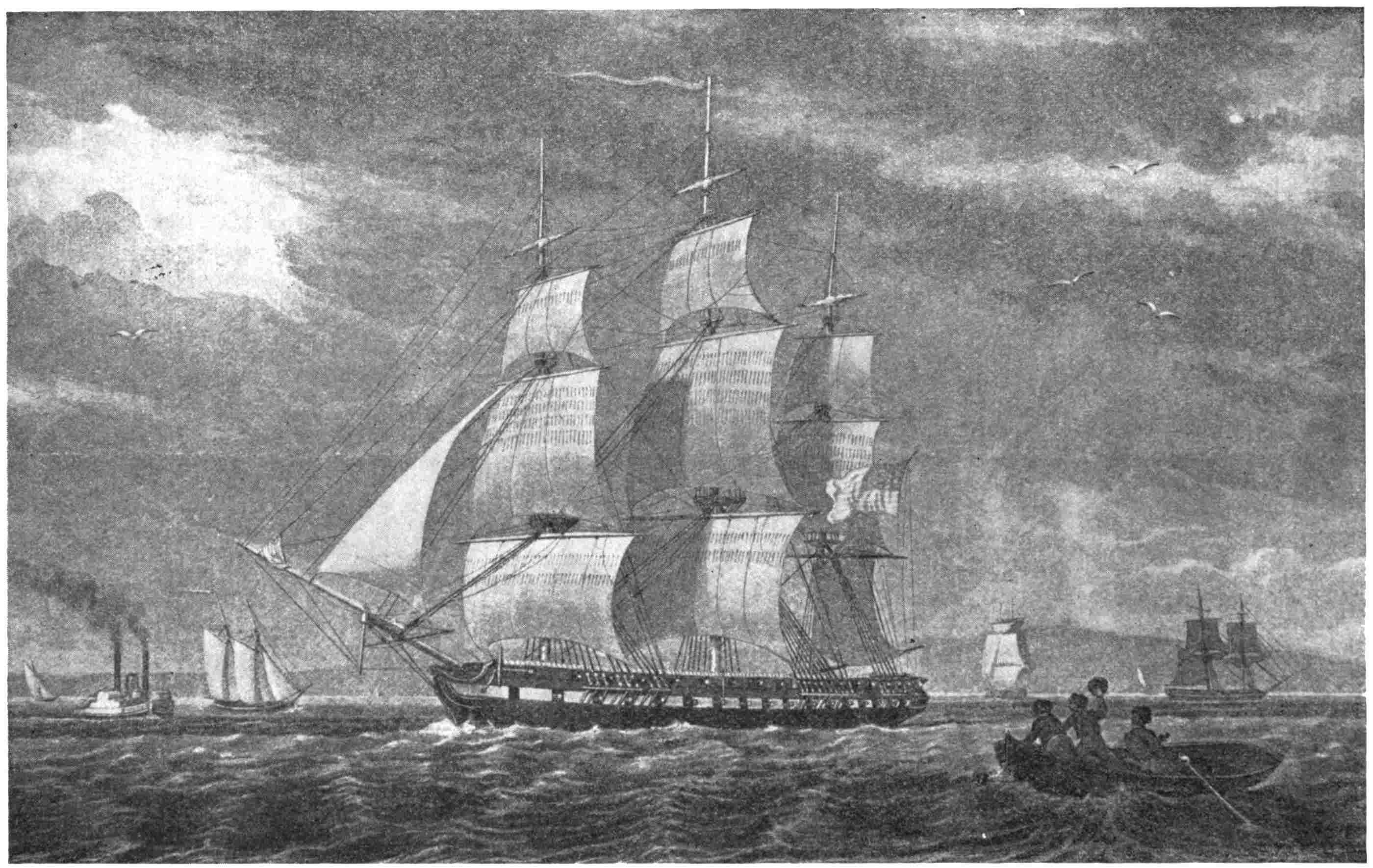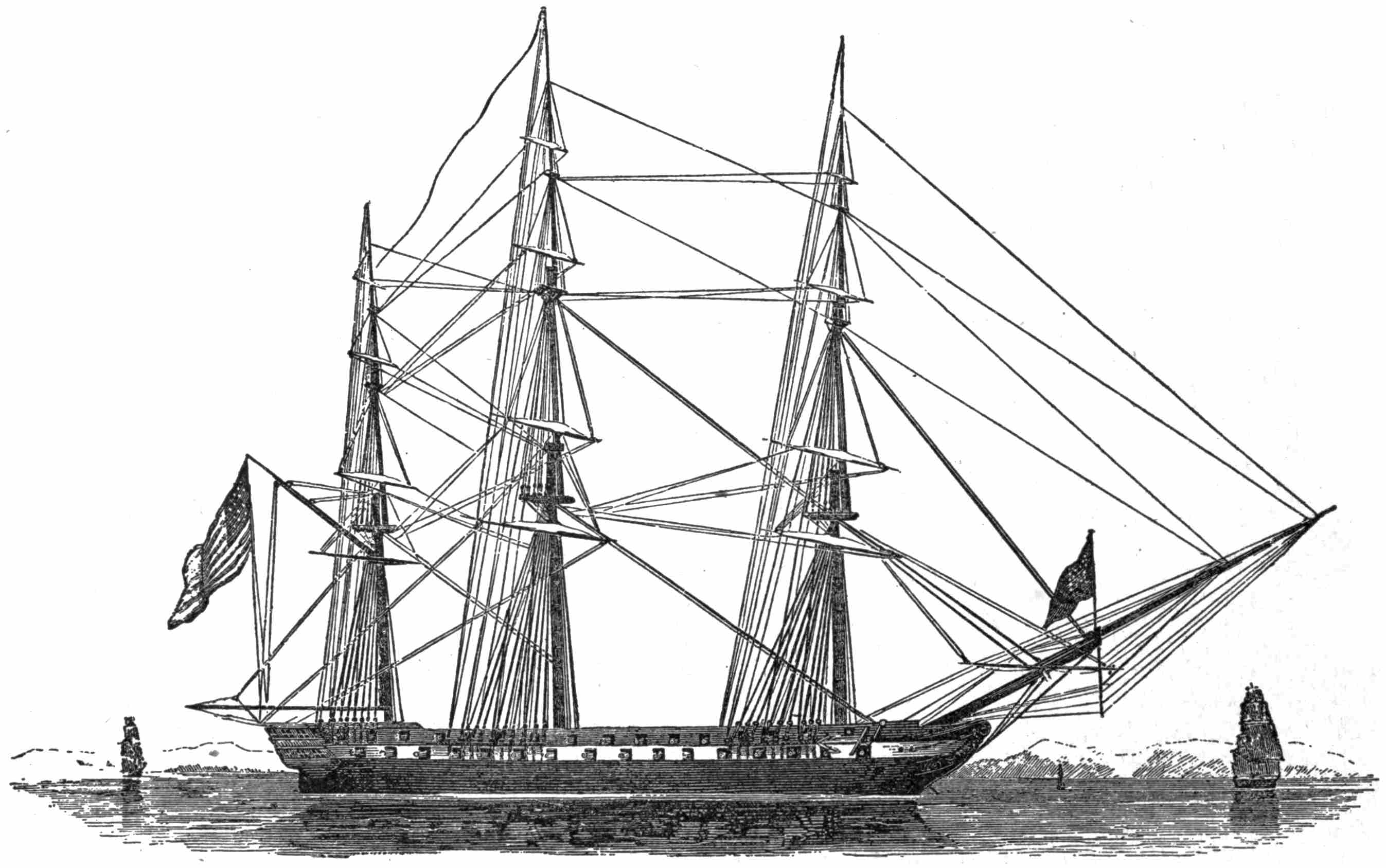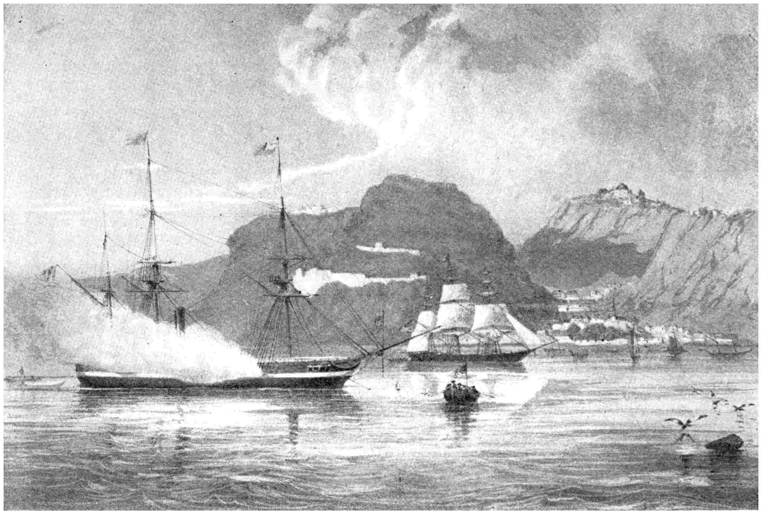 No elaborate résumé of the doings of the scientific explorers of the Navy can be given here. The exploring expedition of Lieutenant Charles Wilkes, with the sloops Vincennes and Peacock, the brig Porpoise, the store-ship Relief, and the tenders Sea-gull and Flying Fish, was the most pretentious. It was authorized in 1836, and was directed chiefly to the extreme South, but some work was done among the islands of the Pacific. A number of thick quarto volumes give the reports of officers and specialists, but only people engaged in a scientific study of nature ever fully appreciated the great value of the work done. Lieutenant J. M. Gilliss, assisted by Lieutenant Archibald MacRea, Acting-Master S. L. Phelps, and Captain’s Clerk E. R. Smith, were members of a “United States Astronomical Expedition464 to the Southern Hemisphere” in 1849–52. There was an exploring expedition in the Parana in the steamer Water Witch, which was fired on by the Paraguyan dictator, and the event compelled a show of force, later on, in order to teach the people there to respect the flag. An exploration of the Dead Sea was made by Lieutenant William Francis Lynch, in 1848. In 1850 Lieutenant Edwin J. De Haven sailed from New York with the brigs Rescue and Advance, in search of the remains469 of Sir John Franklin, the Arctic explorer. A proper relation of what was accomplished by these and other expeditions of the kind would fill a large and most interesting work. But it may be said here that only a cursory examination of the reports of the officers making them is needed to show not only that the naval officers were fitted for the work in hand, but that the work accomplished was in its influence upon humanity in general, as well as upon the American nation, well worth its cost.