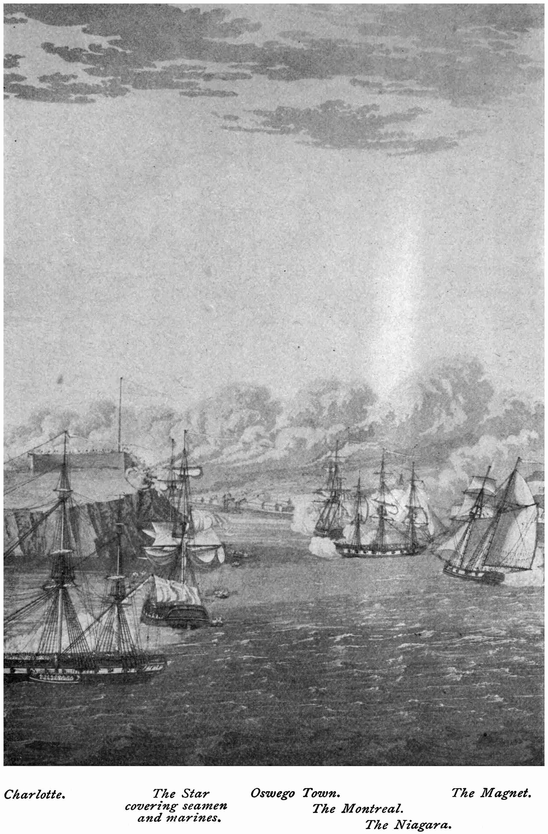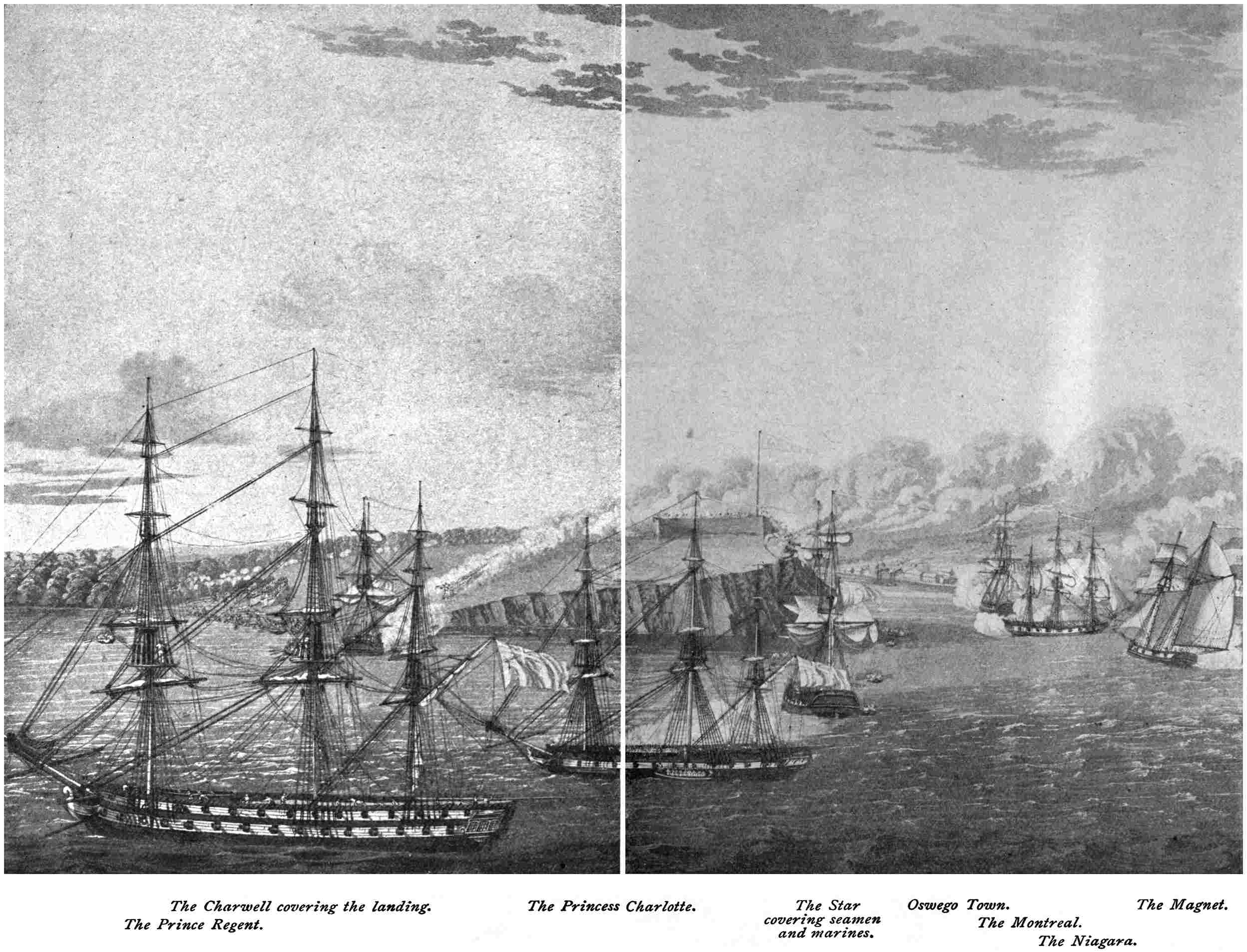 | The Attack on Fort Oswego, Lake Ontario, May 6, 1814. (From an engraving, published in 1815, by R. Havel, after a drawing of Lieutenant Hewett, Royal Marines), | 118–119 |