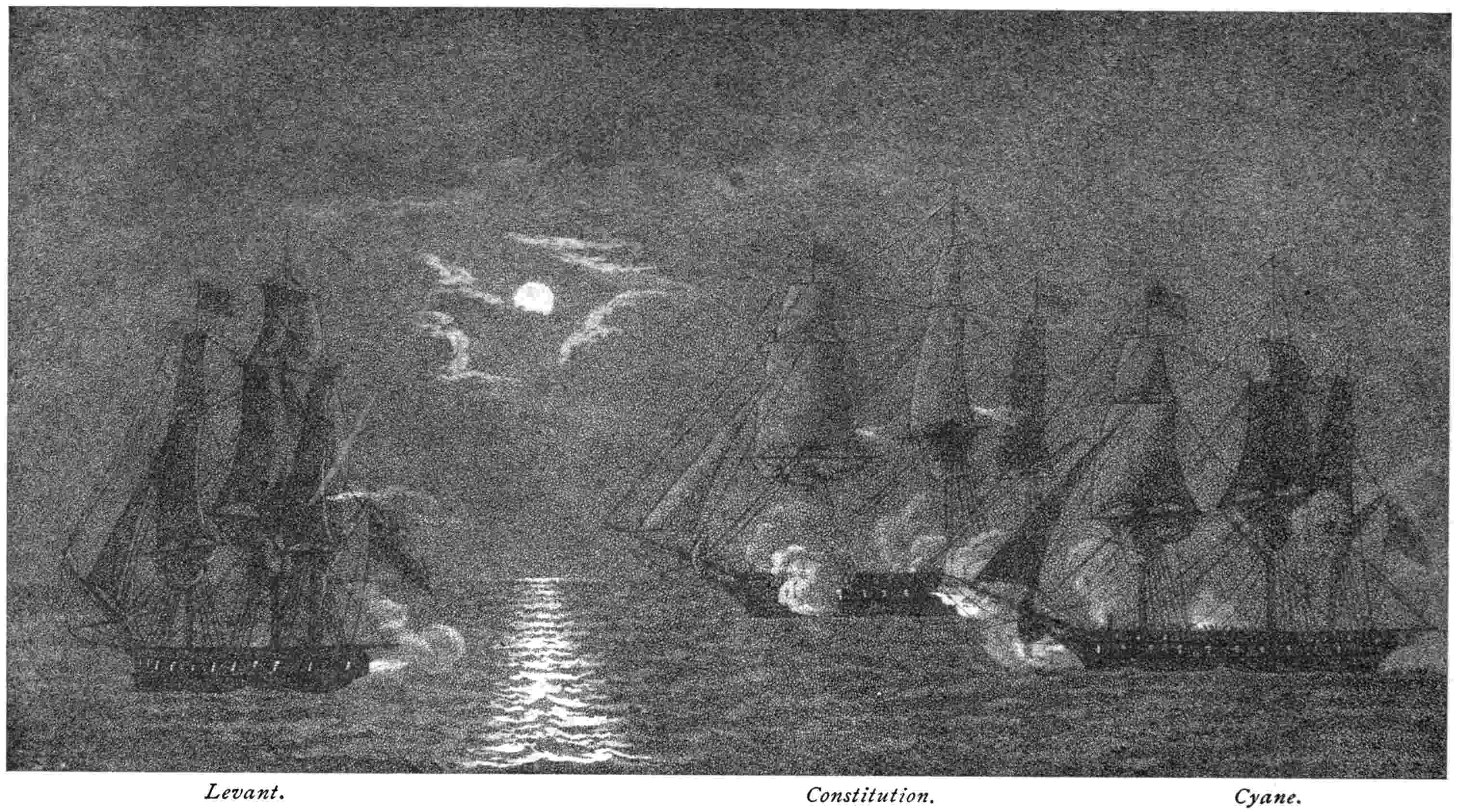 | She was a Long Time Idle in Port—A Touching Tale of Sentiment—Away at Last—Captain Stewart’s Presentiment—Found Two of the Enemy as he had Predicted—A Battle where the Yankee Showed Mastery of the Seaman’s Art—Captain Stewart Settled a Dispute—Caught Napping in Porto Praya—Swift Work Getting to Sea—A Most Remarkable Chase—Three British Frigates in Chase of Two Yankee Chose to Follow the Smaller when the Two Split Tacks—Astounding Exhibit of Bad Marksmanship—A Cause of Suicide—The Poem that Saved Old Ironsides. | |