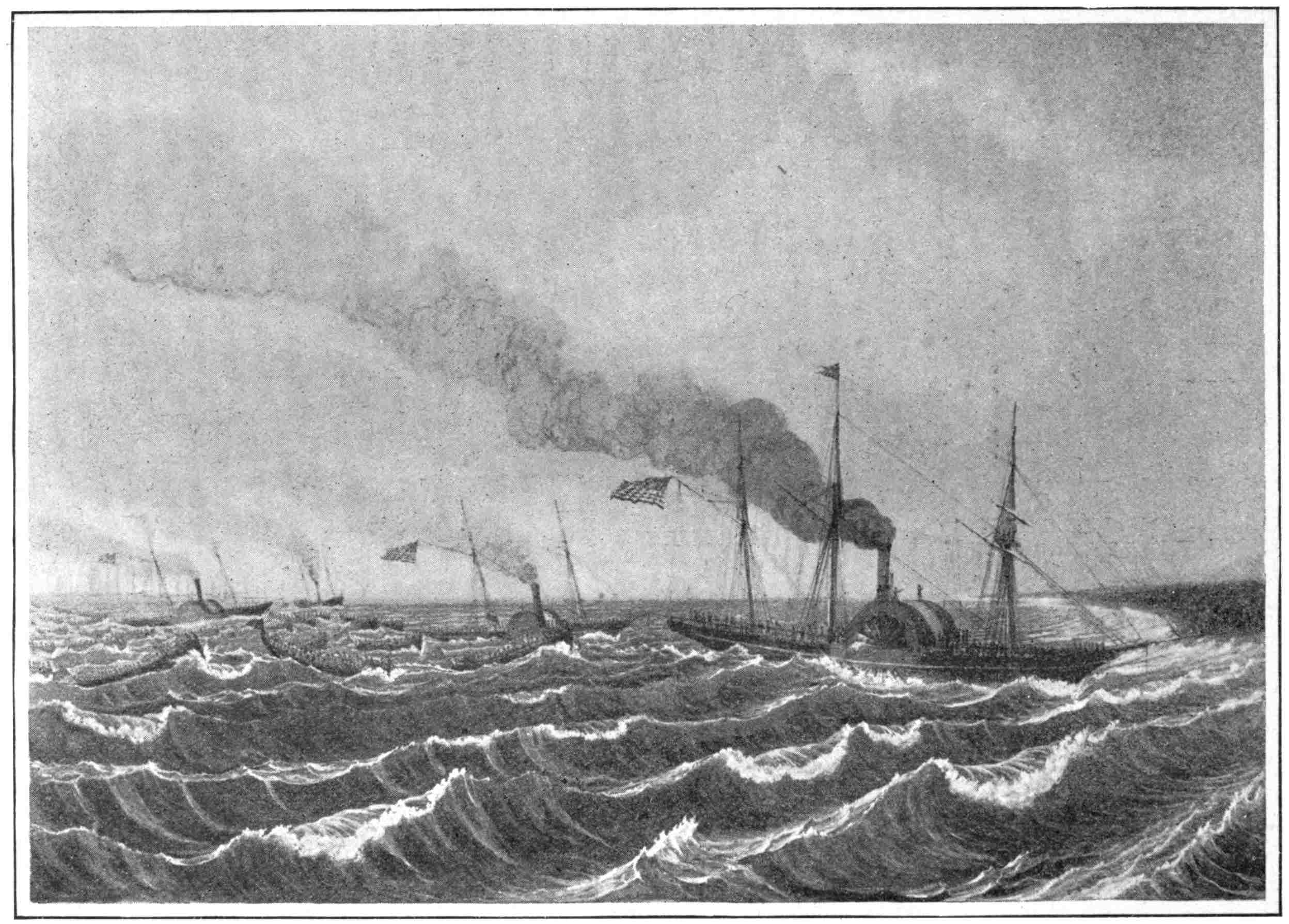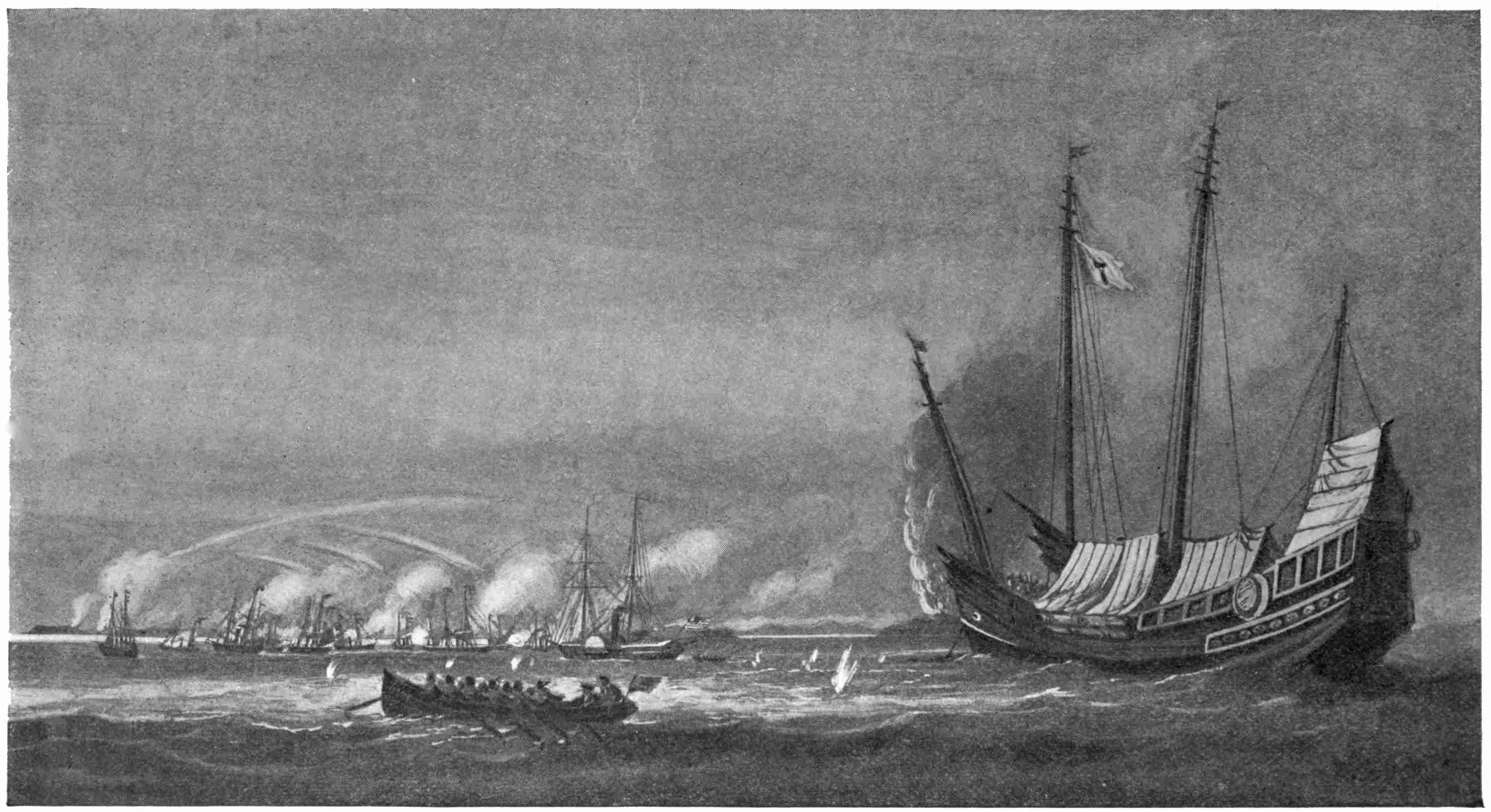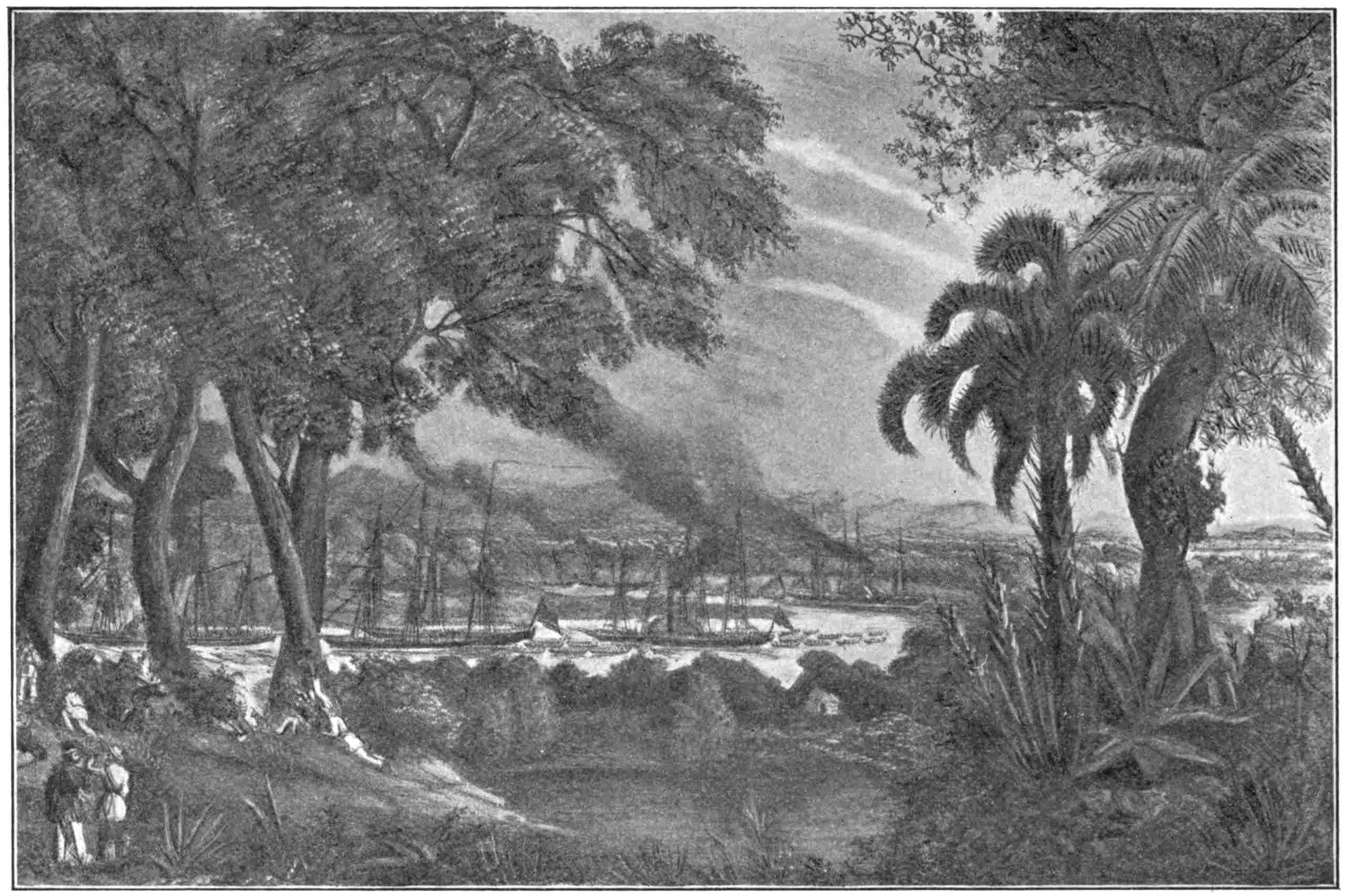 As it happened, there was a fog on the sea that morning, and no steamship had ever entered the harbor before that day. This combination of circumstances—the sudden appearance of two big ships propelled out of the fog, with two others in tow, by a power they had never seen, made a profound impression on the people. Yet it was not the impression that an ignorant people would have received, for the authorities were expecting the fleet, having444 heard of it through the Dutch, and they had read about and had seen pictures of steamships and steam-cars as well.