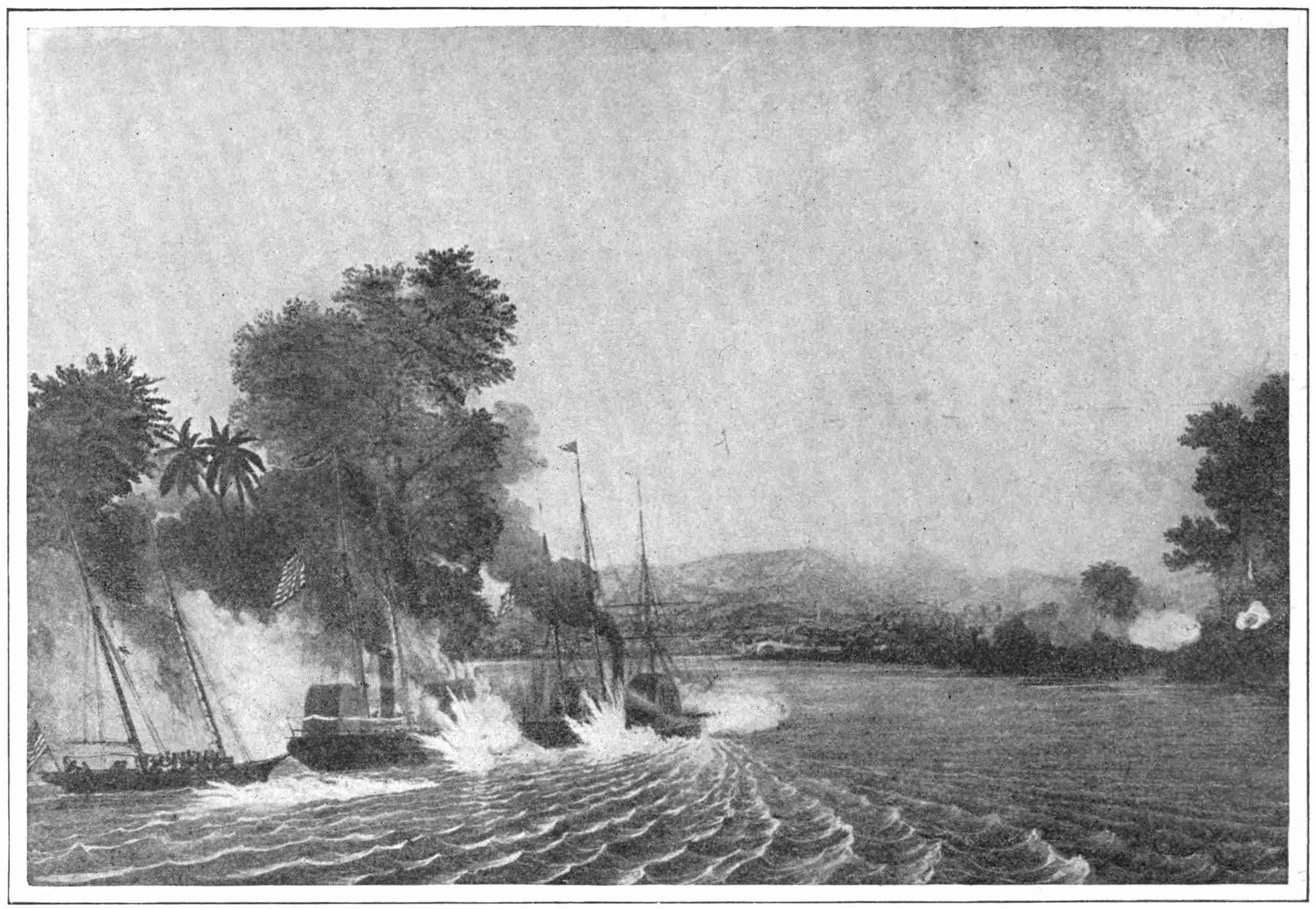Seeing this, Commodore Perry, who had relieved Conner on the 21st, ordered four vessels into the harbor to divert the attention of the enemy from the battery. Lieutenant Josiah Tattnall was fortunate enough to get command of this little squadron, and with it discretion to go where he pleased. Accordingly he advanced to within eighty yards of the castle and then went still farther in. The fire he drew on his boats was terrific—so terrific, in fact that Commodore Perry, to save the vessels, that seemed doomed to immediate destruction, signalled Tattnall to return; but Tattnall was too busy to look for signals and did not see them. So a small boat had to be sent to bring the intrepid crews away.