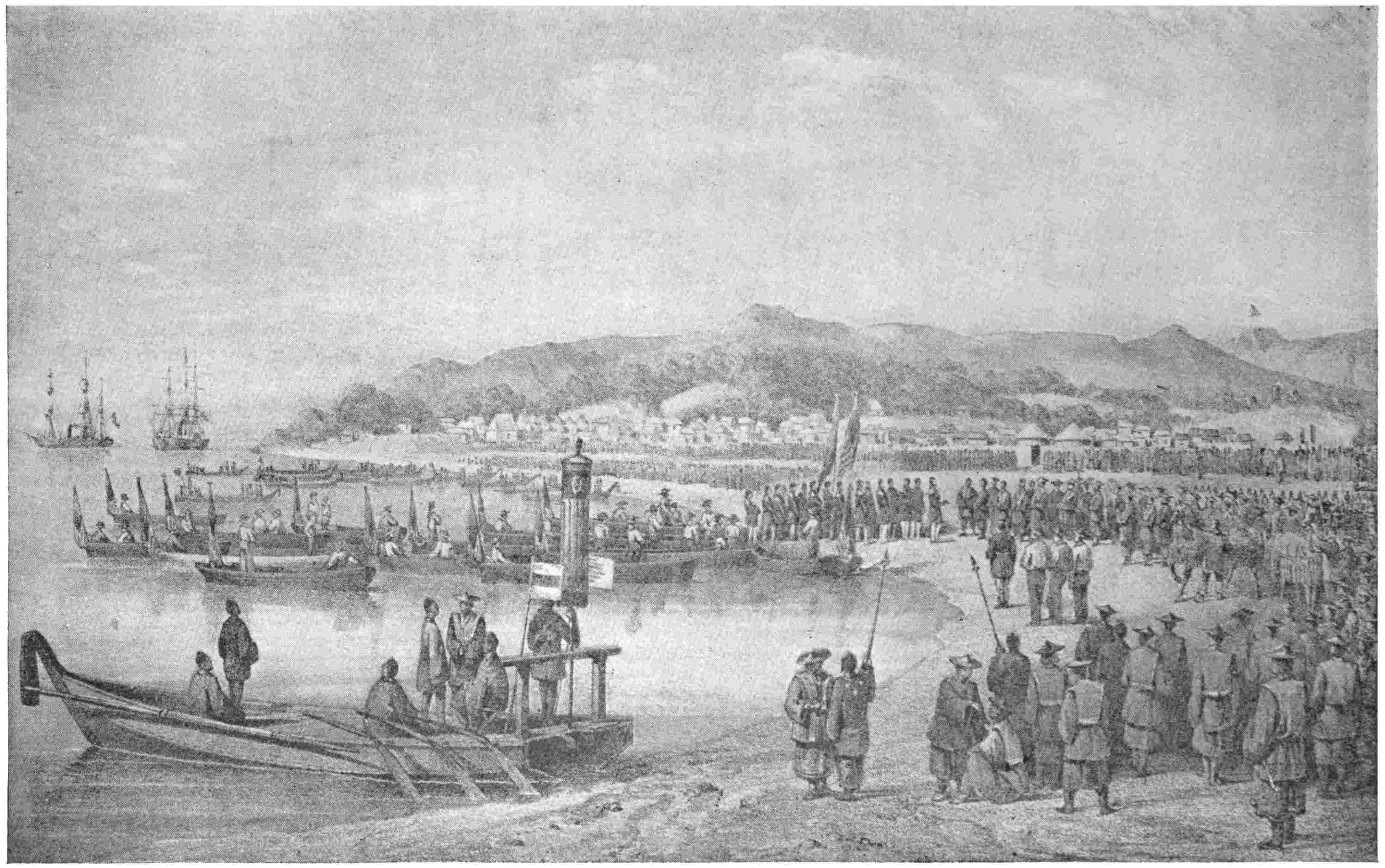 In February the commodore returned for the Emperor’s reply to the President’s message requiring a commercial treaty. He came with the steamers Powhatan, Mississippi, and Susquehanna, with the Lexington, Vandalia, and Macedonian in tow. They insisted on anchoring farther up the bay than before—at Yokohama, within nine miles of the capital. Here458 the commodore continued the practices of the former visit, and the business of the expedition was concluded in the signing of a treaty which granted everything that the Americans could reasonably demand—a treaty, it is worth noting, that has been of greater benefit to Japan than to the nation that insisted on making it.