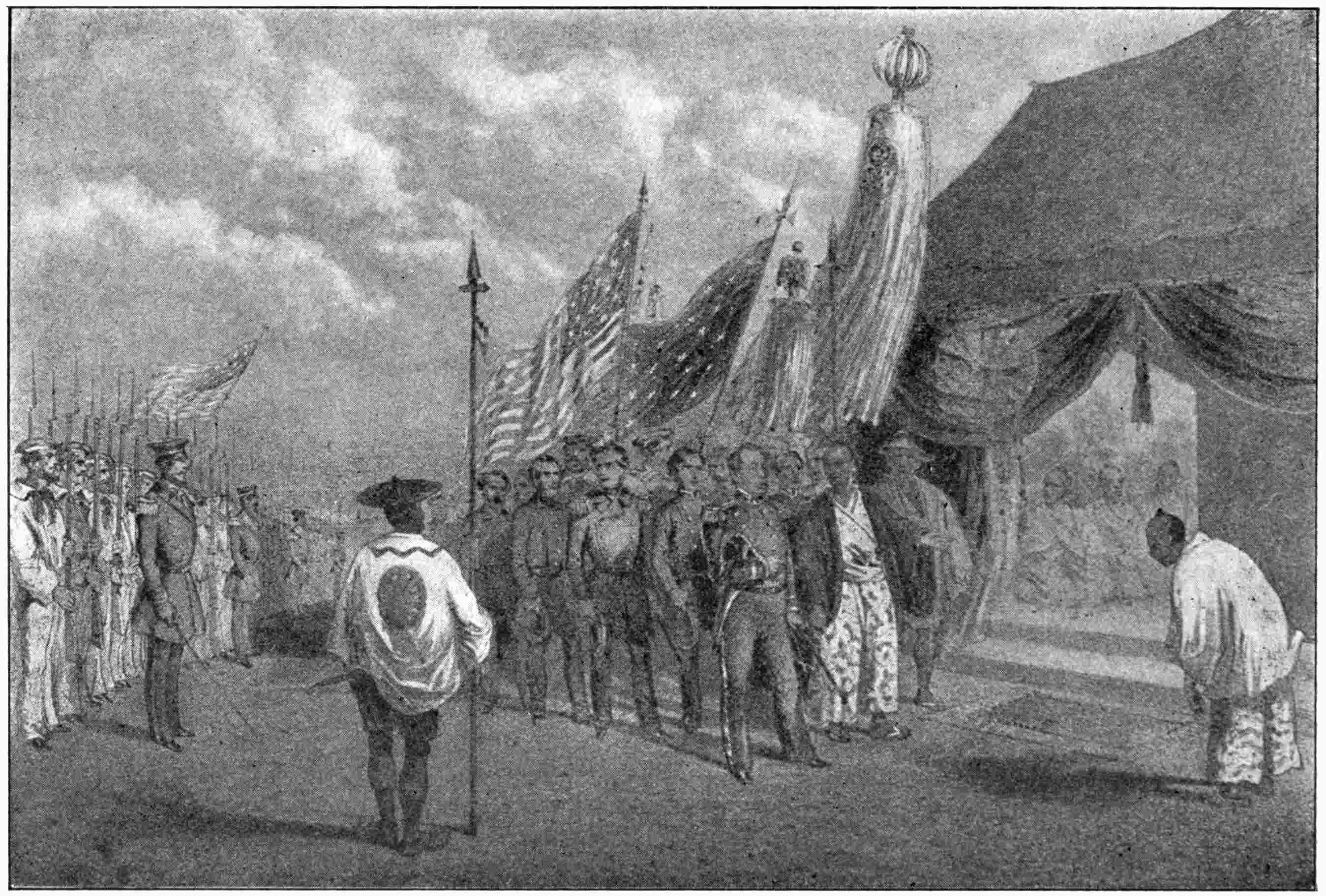 On reaching the shore the American guard,456 consisting of four hundred marines and sailors, lined up to salute the commodore. Then a procession was formed, with the commodore in a sedan-chair borne by Chinese members of the crew, while the letter of the President and the credentials of the commodore were borne by two negroes selected for their size and bearing. These documents, by the way, were written on vellum of folio size, the big seals were enclosed in solid gold boxes, and the documents were enclosed in gold-mounted caskets.