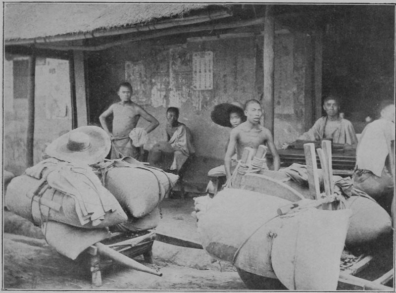 Out in the country there are practically no roads, as we understand roads. It is necessary to cultivate every inch of available ground, and the farmer begrudges anything taken from the fields for the paths, which are but a foot or two wide. It is easy to understand that, under such conditions, the almost universal mode of passenger transit is by chairs and bearers. The narrowness of the paths is a source of trouble. When two parties of bearers approach each other, there is much shouting to induce one or other to return and make way; but when both come on, one has to get off, or be pushed off, into the swamp by the sides. When one is a foreigner his portion is invariably the swamp.