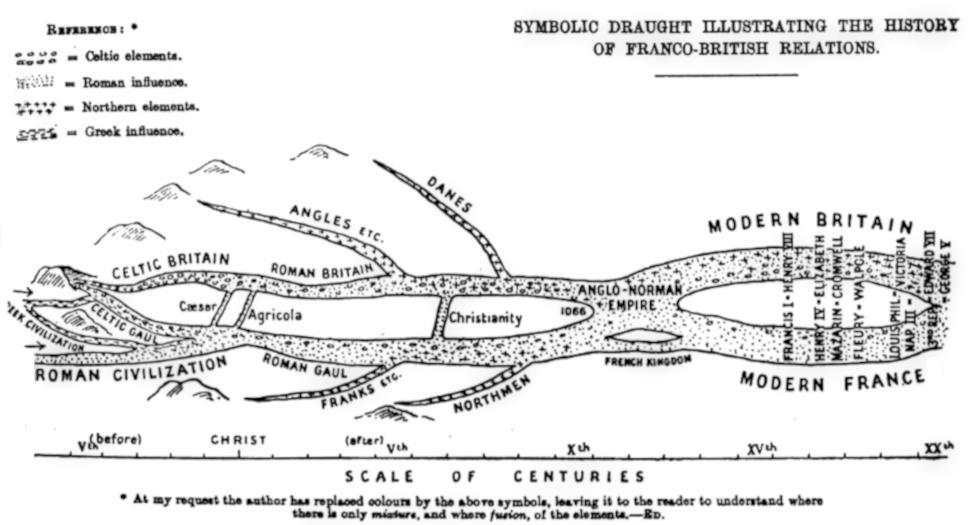 To make that fellowship apparent, at a glance, at least from certain points of view, I have devised the appended diagram. There you see represented, as it were, the streams of the history of our two nations from their farthest origins down to our own times. Please note the scale of centuries. See both streams rising about eight or six centuries before Christ in the same mountain—if I may say so figuratively—in the same mountain of the Celtic race. They spring, as you see, from the same source, and, though geographically divided, their waters remain a long time of the same colour—green in my draught.
