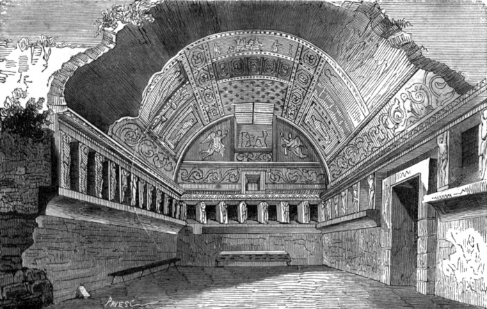 In Pompei l’Odeum era destinato alla recitazione delle commedie, ai concorsi poetici, alle rappresentazioni mimiche e satiriche, e se si vuole argomentare dall’uso generale di tali ritrovi, alle dispute filosofiche ed anche agli spettacoli d’inverno, e per ciò coperto; onde, per dirla con Tertulliano, l’impudico divertimento non fosse dal rigore della stagione turbato[4]. Il severo giudizio di questo padre della Chiesa cristiana era giustificato dalla licenziosa libertà sempre esistita nei ludi scenici e circensi, ma fatta ancor più sfrenata negli ultimi tempi dell’Impero.