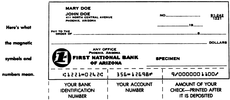 Numbers across bottom of check are printed in magnetic ink and can be read by the computer.
