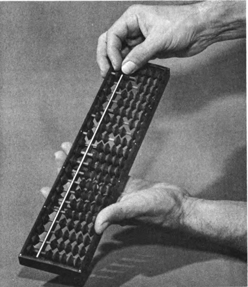 The most successful computer used for the next 5,000 years, the portable counter, or the abacus, is a masterpiece of simplicity and effectiveness. Though only a frame with several rows of beads, it is sophisticated enough that as late as 1947 Kiyoshi Matsuzake of the Japanese Ministry of Communications, armed with the Japanese version—a soroban, bested Private Tom Wood of the U. S. Army of Occupation punching the keys of an up-to-the-minute electric calculating machine in four of five problem categories! Only recently have Japanese banks gone over to modern calculators, and shopkeepers there and in other lands still conduct business by this rule of thumb and forefinger.