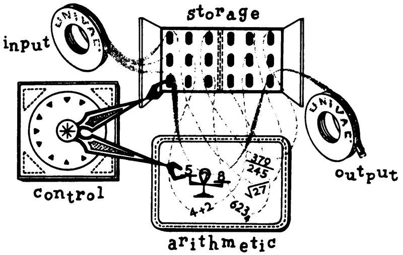 As with many other important inventions, the computer and its technology were spurred by war and are aided now by continuing threats of war. It is therefore pleasant to think on the possibilities of a computer system “programmed” for peace: a gigantic, worldwide system whose input includes all recorded history of all nations, all economic and cultural data, all weather information and other scientific knowledge. The output of such a machine hopefully would be a “best plan” for all of us. Such a computer would have no ax to grind and no selfish interests unless they were fed into it.