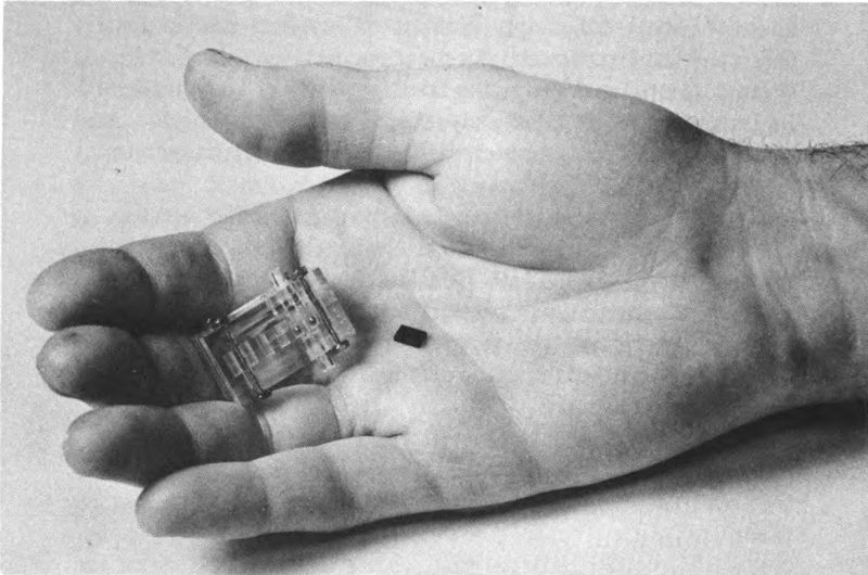 Memory circuits once were mechanical relays or tube circuits. Briefly they were transistorized, and then ferrite cores. Magnetic thin-film circuits have now been developed, making random-access storage almost as compact as the sequential tape reel. As circuits grow smaller the major problem is manipulating them, or even seeing them, and a sneeze can be disastrous in today’s electronics plant.