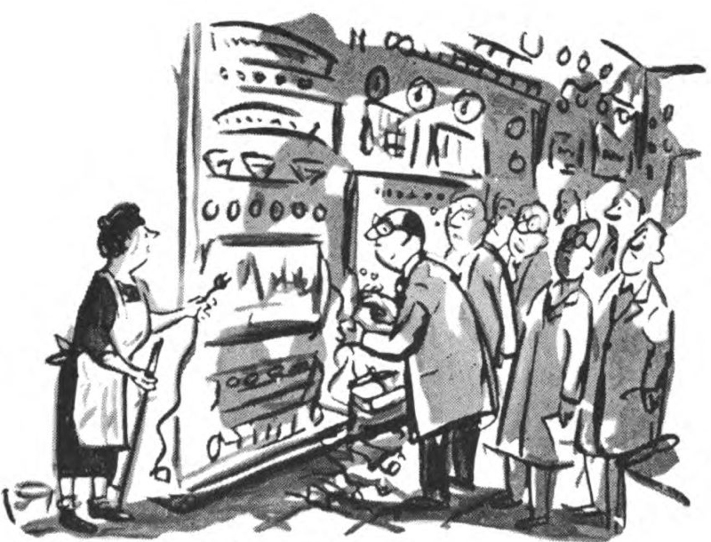 While we envision such far-reaching applications, let’s not lose sight of the possibilities for computer use closer to home—right in our homes, as a matter of fact. Just as early inventors of mechanical power devices did not foresee the day when electric drills and saws for hobbyist would be commonplace and the gasoline engine would do such everyday chores as cutting the grass in our yards, the makers of computers today cannot predict how far the computer will go in this direction. Perhaps we may one day buy a “Little Dandy Electro-Brain” and plug it into the wall socket for solving many of the everyday problems we now often guess wrong on.