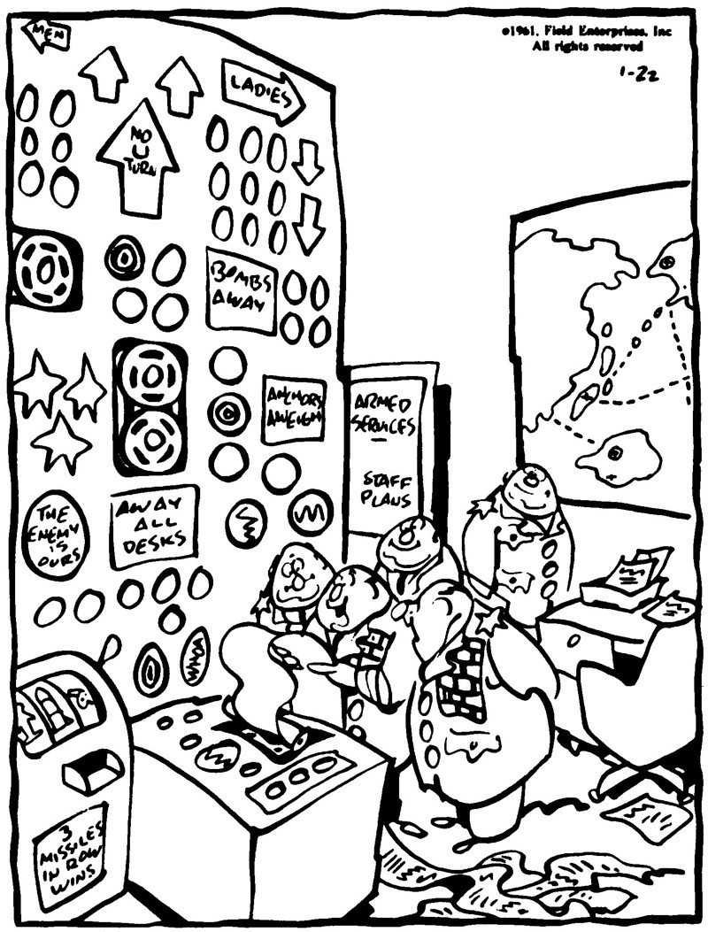 Perhaps guarding against that eventuality is the most important 257job the computer can do. Applications of computing power to government have been given; and hints made of the sure path from simple tasks like the census and income tax, Peace Corps work, and so on to decision-making for the president. Just as logic is put to work in optimizing business, it can be used to plan and run a taut ship of state. At first such an electronic cabinet member will be given all available information, which it will evaluate so as to be ready to make suggestions on policy or emergency action. There is more reason for it going beyond this status to become an active agent, than there is against. Government has already become so complex that perhaps a human brain, or a collection of them, cannot be depended on to make the best possible decision. As communications and transportation are speeded up, the problem is compounded. Where once a commander-in-chief could weigh the situation for days before he had to commit himself and his country to a final choice, he may now be called upon to make such a far-reaching decision in minutes—perhaps minutes from the time he is awakened from a sound sleep. The strongest opposition to this delegation of power is man’s own vanity. No machine can govern, even if it can think, the politician exclaims. The soldier once felt the same way; but operations research has given him more confidence in the machine, and SAGE and NORAD prove to him that survival depends on the speed and accuracy of the electronic computer.