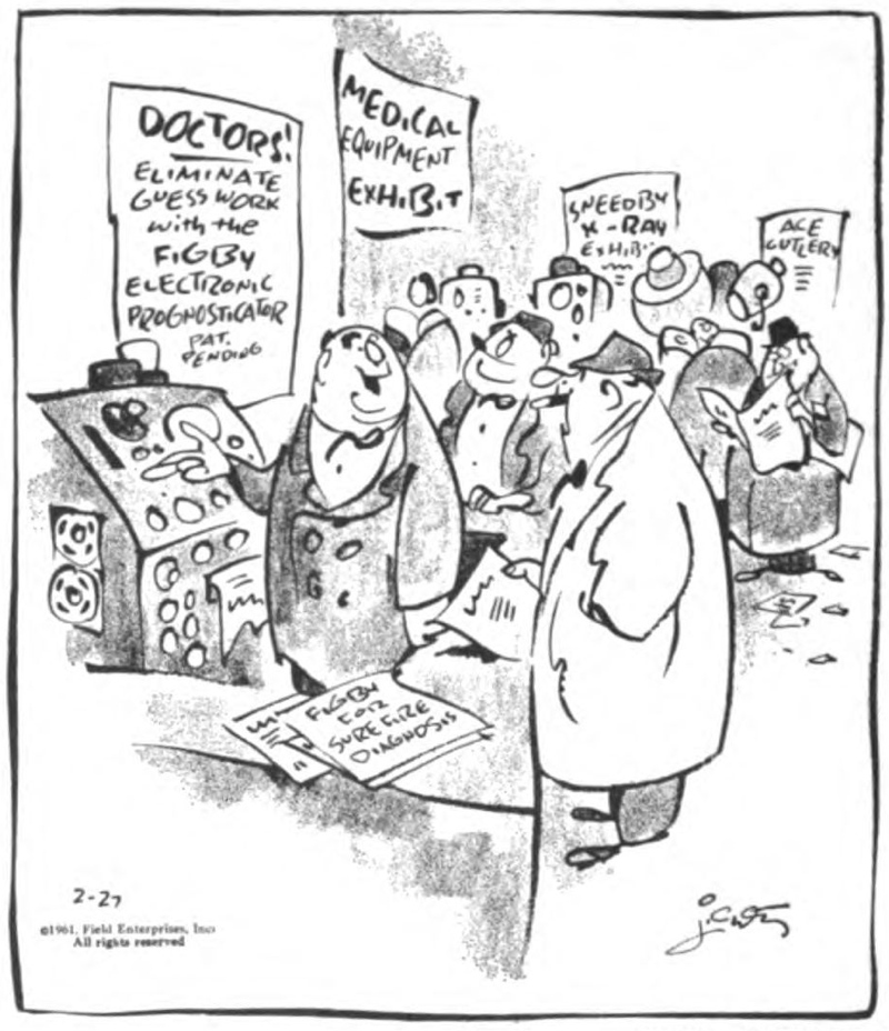 We get a not-too-fanciful look into the future in a paper by Dr. Louis Fein presented in the summer 1961 issue of American Scientist, titled “Computer-related Sciences (Synnoetics) at a University in 1975.” Dr. Fein is an authority on computers, as builder of RAYDAC in 1952, and as founder and president of the Computer Control Company. The paper ostensibly is being given to alumni some years hence by the university president. Dr. Fein tells us that students in the Department of Synnoetics study the formal languages used in communication between the elements of a synnoetic system, operations research, game theory, information storage, organization and retrieval, and automatic programming. One important study is that of error, called Hamartiology, from the Greek word meaning “to miss the mark.”