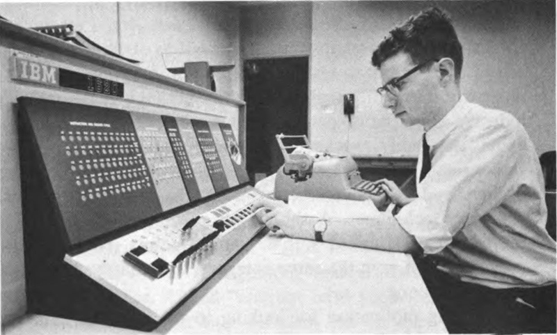 Programmer at console of computer used in electronic processing of bank checking accounts.