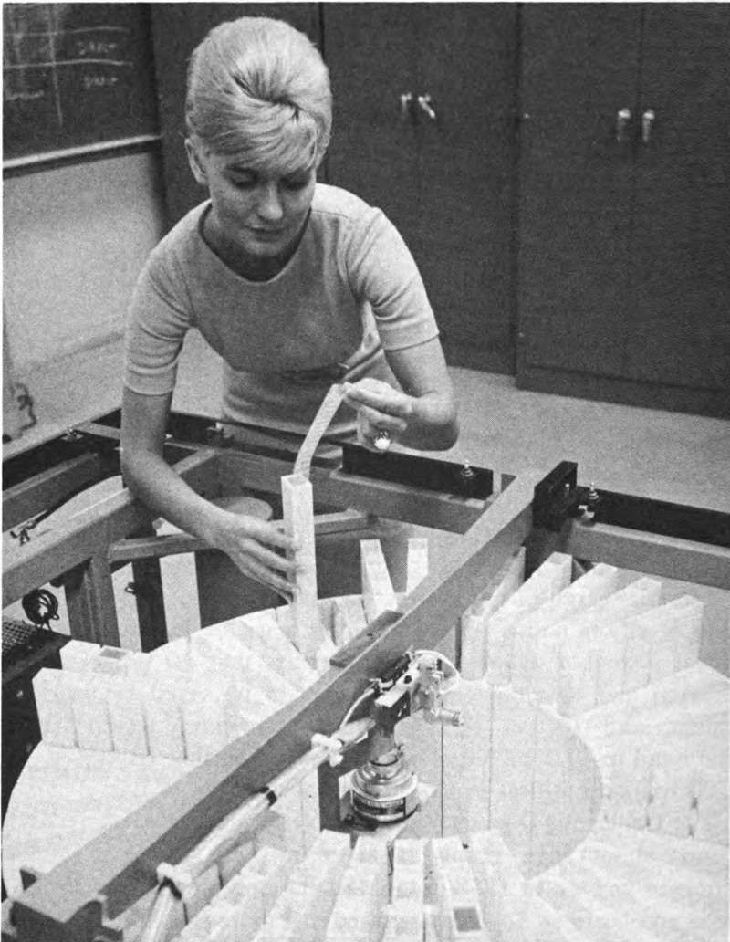 Computers are a vital part of automation, and already they are running production lines and railroads, making mechanical drawings and weather predictions, and figuring statistics for insurance companies as well as odds for gamblers. Electronic machines permit the blind to read a page of ordinary type, and also control material patterns in knitting mills. This last use is of particular interest since it represents almost a full circle in computer science. Oddly, it was the loom that inspired the first punched cards invented and used to good advantage by the French designer Jacquard. These homely forerunners of stored information sparked the science that now returns to control the mills.