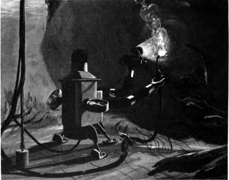 Withstanding underwater pressures, at depths too great for human divers, a Mobot vehicle demonstrates in this artist’s concept how it can perform salvage and rescue operations at the bottom of the ocean.
