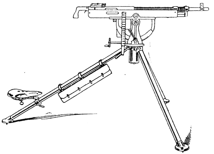 Weight of the ·303-in. gun, 60 lbs. Weight of the tripod, 48 lbs. Weight of ammunition box containing one filled belt, Mark VI 21 lbs., Mark VII 19½ lbs.
