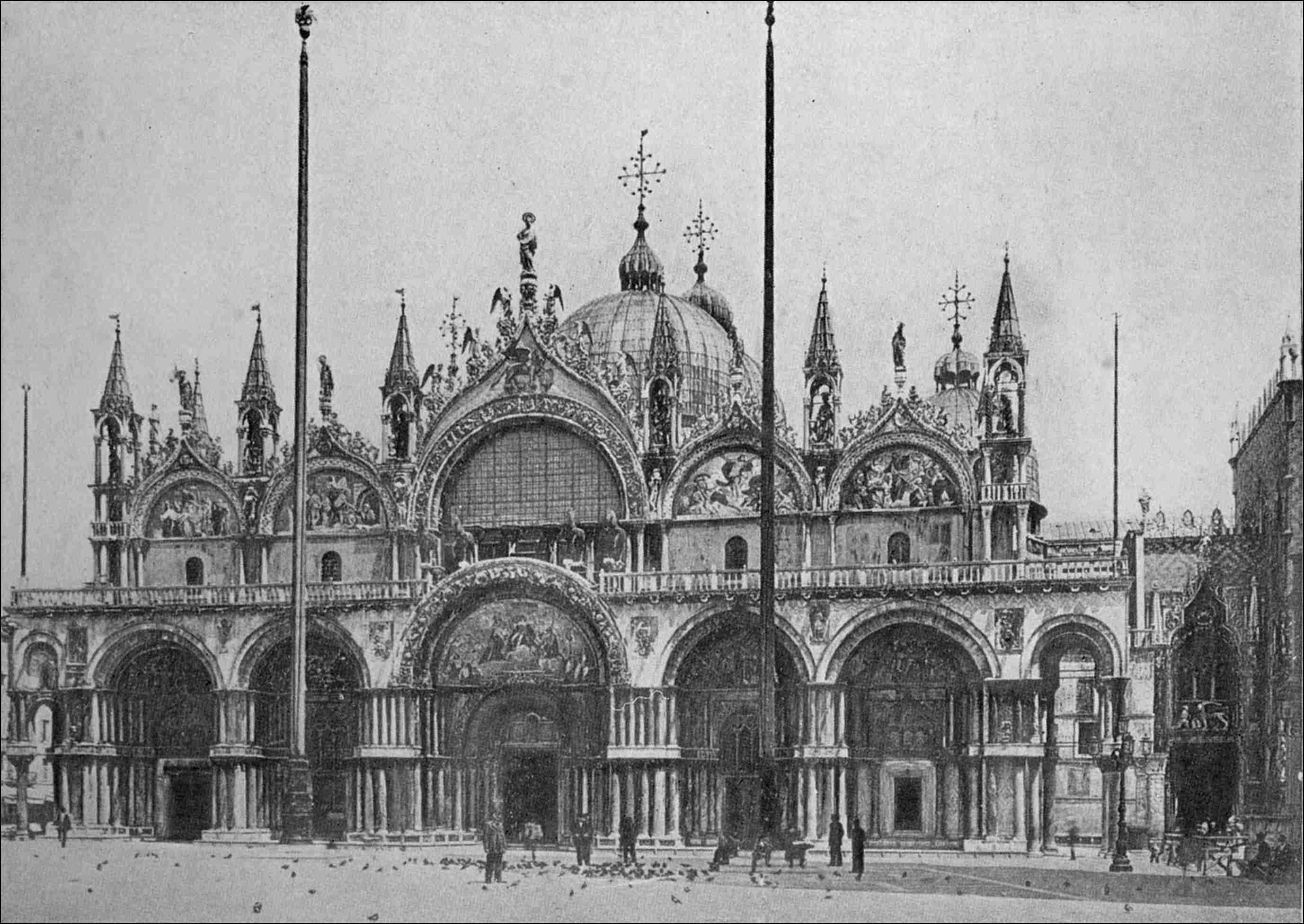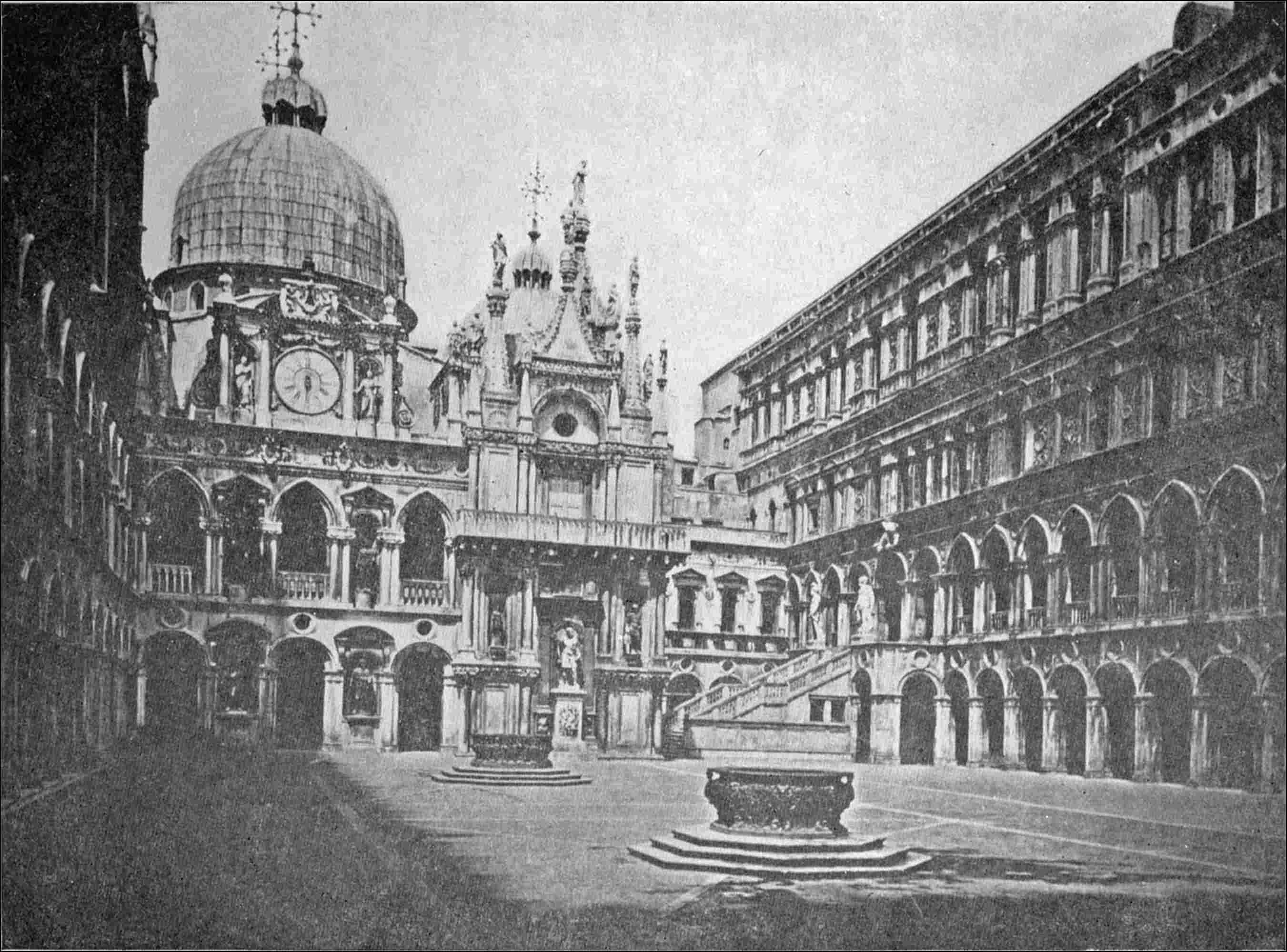 I may also especially point out the bird feeding its three young ones on the seventh pillar on the Piazzetta side; but there is no end to the fantasy of these sculptures; and the traveller ought to observe them all carefully, until he comes to the great pilaster or complicated pier which sustains the party wall of the Sala del Consiglio; that is to say, the forty-seventh capital of the whole series, counting285 from the pilaster of the Vine angle inclusive, as in the series of the lower arcade. The forty-eighth, forty-ninth, and fiftieth are bad work, but they are old; the fifty-first is the first Renaissance capital of the lower arcade; the first new lion’s head with smooth ears, cut in the time of Foscari, is over the fiftieth capital; and that capital, with its shaft, stands on the apex of the eighth arch from the Sea, on the Piazzetta side, of which one spandril is masonry of the Fourteenth and the other of the Fifteenth Century....