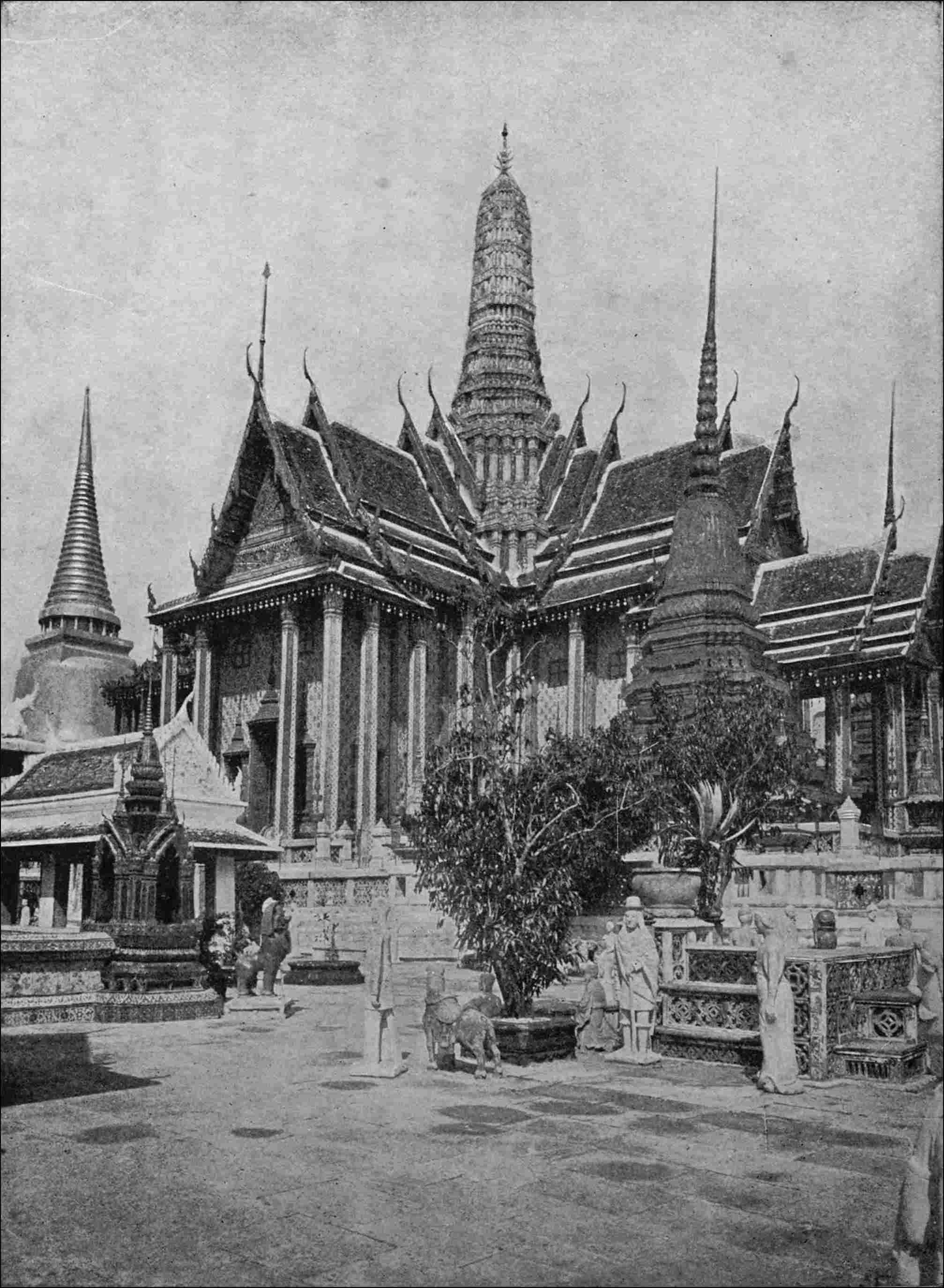 It would be impossible to collect within the small boundaries of a single volume sketches and pictures of all the masterpieces of architecture, and a vast amount of interesting literature has had to be ignored. I have tried, however, to gather choice examples of as many different styles of architecture as possible and to give a description, wherever practicable, of each building’s special object of veneration, such as the Christ of Burgos and the Cid’s coffer in the same Cathedral; the Emerald Buddha at Wat Phra Kao, Bangkok; the statue of Our Lady at Toledo; the shrine of St. Thomas à Becket at Canterbury; etc., as well as the specialvi feature for which any particular building is famous, such as the Court of Lions in the Alhambra; the Chapel of Henry VII. in Westminster Abbey; the Convent of the Escurial; the spiral stairway at Chambord; etc., and also a typical scene, like the dance de los seises in the Cathedral of Seville; and the celebration of Easter at St. Peter’s.