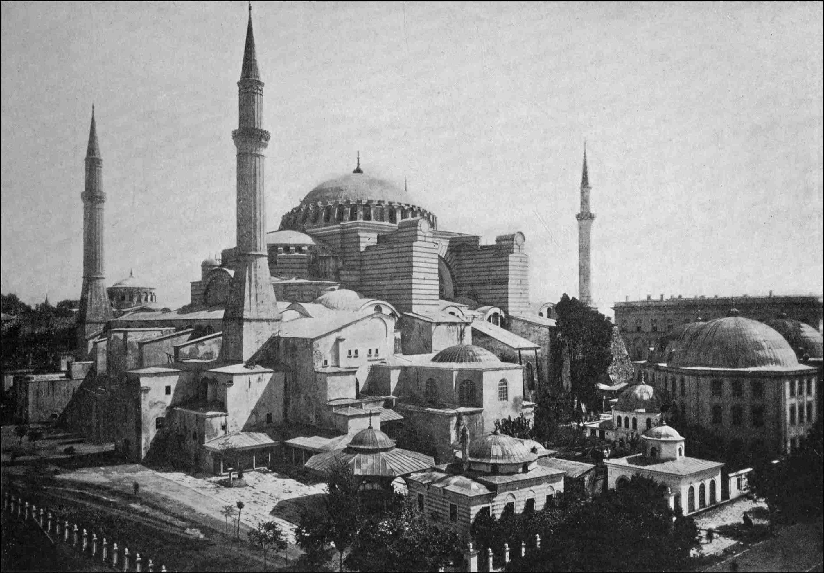 “Here we are,” said one of my hosts, as we suddenly stopped before a vast edifice. I thought it was a fortress; but it was the wall that surrounded the Mosque, in which formerly opened twenty large bronze doors surrounded by graceful arabesques and arched windows supported by light columns; it is now covered with a triple coat of plaster.287 A trip around the boundary-wall is a nice little walk after dinner: you can judge then of the extent of the building.
