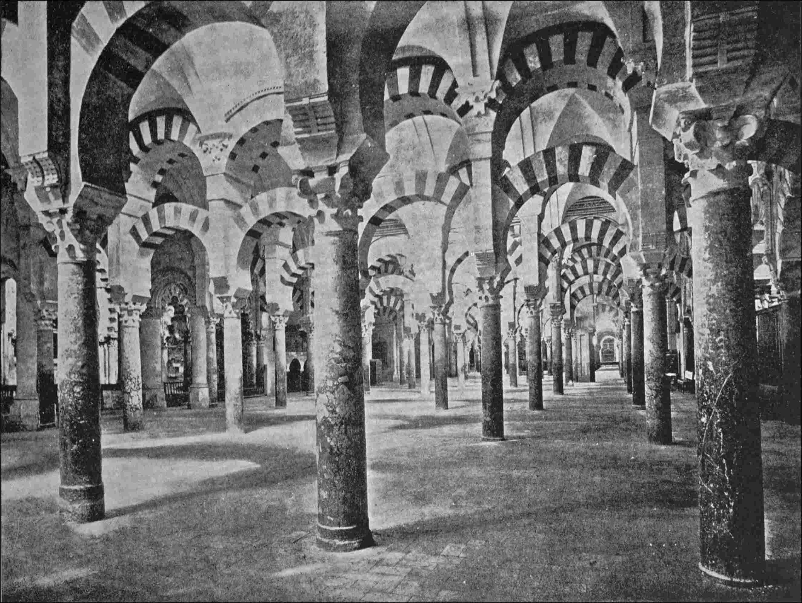 The Mosque of Cordova, which was converted into a cathedral when the Moors were expelled but which has, notwithstanding, always remained a Mosque, was built on the ruins of the primitive cathedral not far from the Guadalquiver. Abd-er-Rahman began to build it in the year 785 or 786. “Let us build a Mosque,” said he, “which will surpass that of Bagdad, that of Damascus, and that of Jerusalem, which shall be the greatest temple of Islam and become the Mecca of the Occident.” The work was begun with ardour; and Christian slaves were made to carry the stones of razed churches for its foundation. Abd-er-Rahman, himself, worked an hour every day; in a few years the Mosque was built, the Caliphs who succeeded Abd-er-Rahman embellished it, and it was completed after a century of continuous labour.